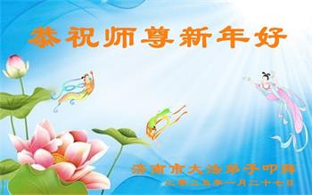 济南大法弟子给师尊拜年,恭祝慈悲伟大的师尊过年好!师父辛苦了!弟子一定学好法、修好自己,提高心性,慈悲理智、智慧的救度有缘人!让师父少为弟子操心!惟愿师尊笑! 山东省济南市在外地的大法弟子恭祝师父过年好!
