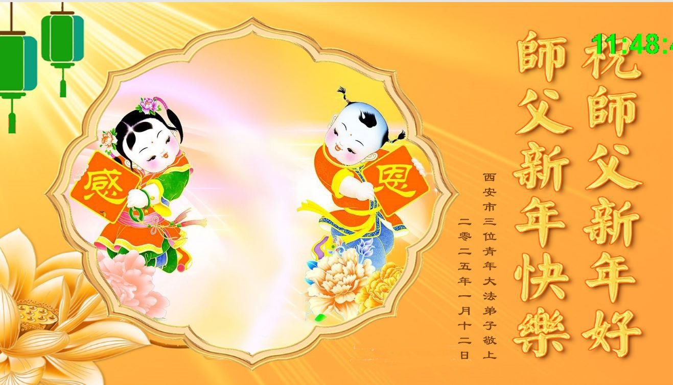 深深的感恩慈悲的师父!新的一年弟子们一定会精進实修,去完成助师正法的使命,请师父放心。恭祝师父新的一年多欢颜多欣慰! 陕西省西安市三位青年大法弟子敬上 吉林省长春市农安县一青年大法弟子全家人恭祝师父过年好!