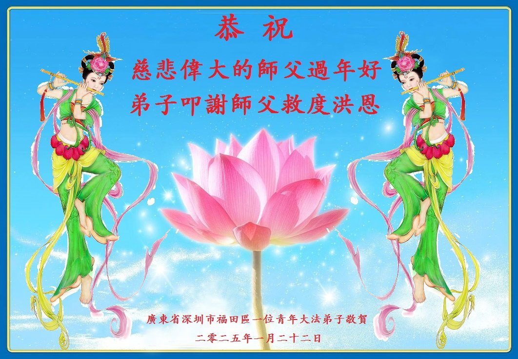 | 【明慧网二零二五年二月一日】二零二五年中国新年之际,中国青年大法弟子献给师父的贺词贺卡纷纷涌来,他们中有的是从大法小弟子成长为青年大法弟子,有的是明白真相后成为大法弟子。生逢在师父传宇宙大法之时,万分感谢师父的伟大赐予,这是大法弟子们生生世世的期盼。 山东诸城一青年大法弟子说:“我从小就跟随着妈妈学大法。在邪恶疯狂时期,我没有退缩,一如既往的坚持大法好,在妈妈多次被抓、被关押期间,我没有动摇信念。” 黑龙江佳木斯一名青年大法弟子说:“我幼年时期体弱多病,哪怕到北京著名医院也查不到疾病原因,医生曾要对我继续抽髓化验查明原因。就在这个时候,我接触了大法,在家人的陪伴下开始学习,孱弱的身体竟然慢慢恢复到健康如初。感谢师父为我们大法弟子的所有付出!感谢师父!再一次恭祝师父新年快乐!” 一位成都大法弟子说:“滚滚红尘曾经埋没了我们的本性,在师尊的慈悲感召下,您的孩子们苏醒了!今天我们正走在返本归真的路上”。 大法弟子们表示:谨遵师父的教导,我们要在这个浊世中逆流而上,做世间中的一股清流。 以下是部份中国大陆青年大法弟子新年献给师父的贺词贺卡: 福建青年大法弟子恭祝师尊新年快乐!