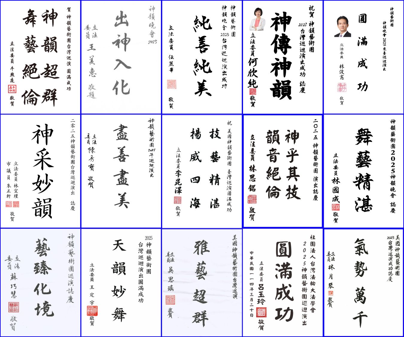 神韵今年将在台湾八大城市演出三十三场,十七位各地方政府首长以地主身份欢迎神韵到来。新北市长侯友宜发文推崇神韵是“神韵飞扬,艺术精湛”。桃园市长张善政祝贺神韵“演出成功”。台中市长卢秀燕赞神韵是“宜神悦耳,舞韵乾坤”。台南市长黄伟哲送上“艺臻化境”。高雄市长陈其迈也祝贺神韵“精彩圆满”。 此外,还有十二位地方首长也致赠贺词迎接神韵到来,包括宜兰县代理县长林茂盛、新竹县长杨文科、新竹市代理市长邱臣远、苗栗县长钟东锦、彰化县长王惠美、云林县长张丽善、嘉义县长翁章梁、嘉义市长黄敏惠、屏东县长周春米、台东县长饶庆铃、澎湖县长陈光复以及金门县长陈福海。 立法委员致赠贺词欢迎神韵莅临  图11~13:美国神韵纽约艺术团莅临台湾前夕,有六十五位立法委员发文欢迎神韵再度莅临。 |