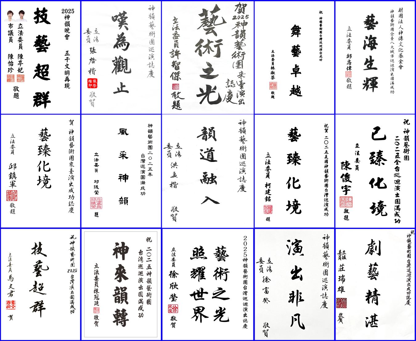 中华民国总统赖清德先生在贺电中说:“欣悉神韵艺术团订于本(114)年2月14日至3月16日于澳洲巡回演出,特电致贺。至盼借由此项盛事,领略舞蹈美学底蕴,丰厚艺术文化内涵,提升知性生活素养,携手为营造优质进步之现代化社会贡献心力。” 百位政要发贺词欢迎神韵莅临 神韵演出是台湾艺文界年度盛事,在神韵艺术团莅临台湾前夕,百位中央政府到地方的各级政要也纷纷发来贺词,包括中央部会首长、地方政府官员、立法委员、议会议长等致赠花篮和贺词,欢迎神韵莅临台湾。赞扬神韵透过艺术传递传统文化,启迪人的善心善念,为台湾民众带来了传递希望、洗涤人心的国际顶级艺术演出。 百位政要包括立法院长、考试院长、内政部长等八位中央部会首长,新北市长、高雄市长、台南市长等十七位地方政府首长,以及十九位议会首长和议员,还有六十五位跨党派立法委员等迎接神韵再度来台演出,并祝神韵演出圆满成功。许多政要多年前就已成为神韵的粉丝。 台湾中央部会首长的祝贺  图8:美国神韵艺术团第十七度莅临台湾前夕,包括中华民国立法院长韩国瑜、外交部长林佳龙等一百零九位中央政府官员及地方政府政要纷纷致赠贺词,迎接神韵再度来台演出。 |