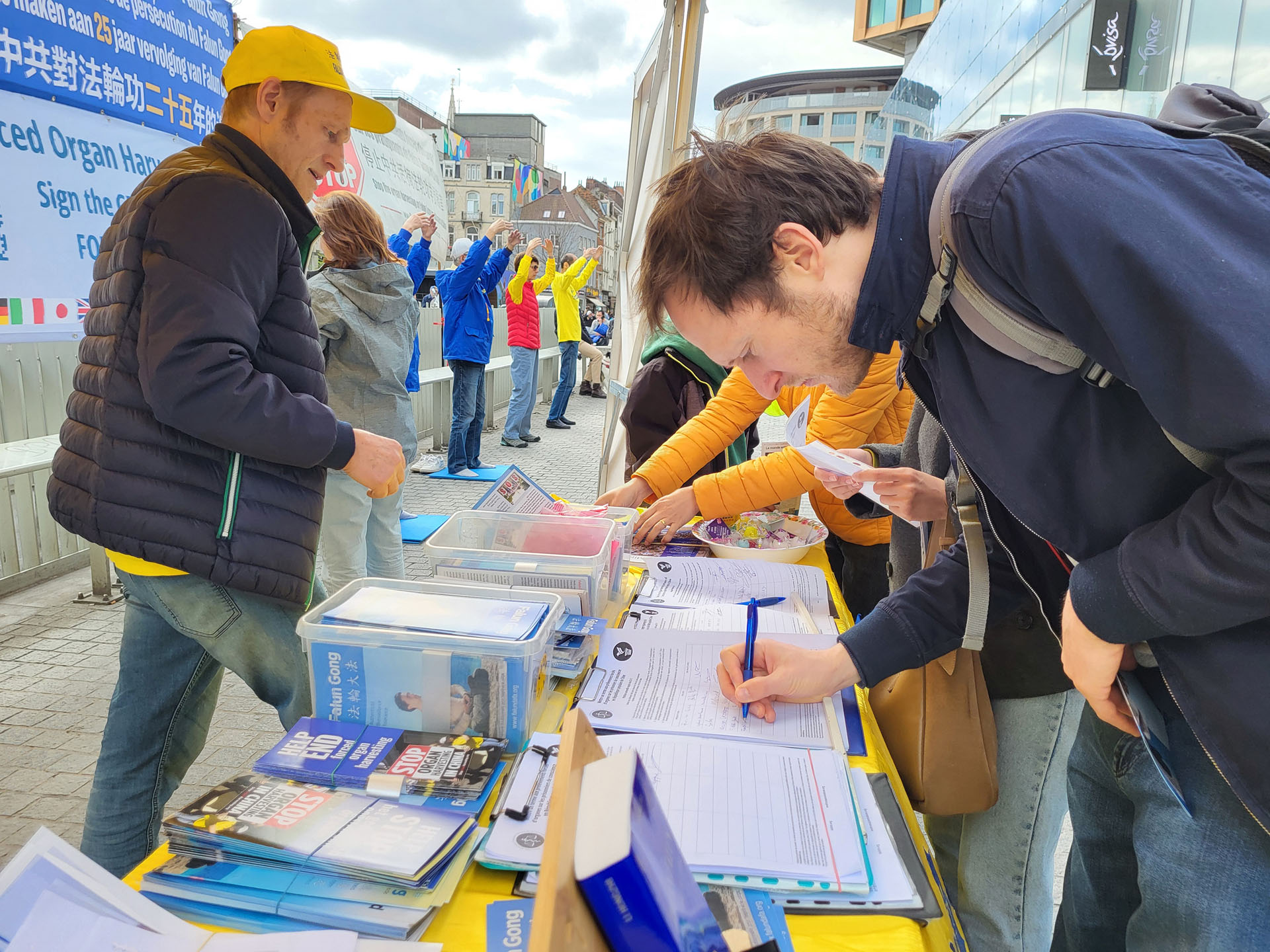 在布鲁塞尔生活多年的法国人阿兰‧波丘尔(Alain Pochour)曾在多个国家旅行,见过法轮功学员炼功,但从未深入了解。这次他停下脚步,聆听了法轮功学员的介绍,并被深深触动。 阿兰表示:“真、善、忍是普世价值。真正的修行是让人变得更善良、更宽容。如果世界上有更多人能遵循真、善、忍,社会就会更加安定。” 他表示:“我无法想象,在现代社会,仅仅因为信仰真、善、忍,人们就会被抓捕、关押,甚至遭受酷刑和活摘器官。”他呼吁国际社会关注这场人权危机,并表示会告诉身边的朋友,希望大家共同制止这场迫害。 民众签名支持 呼吁制止迫害  图16:来自英国的欧文对中共活摘器官的罪行感到震惊和愤怒,他希望通过签名,为制止这场迫害贡献一份力量。 |