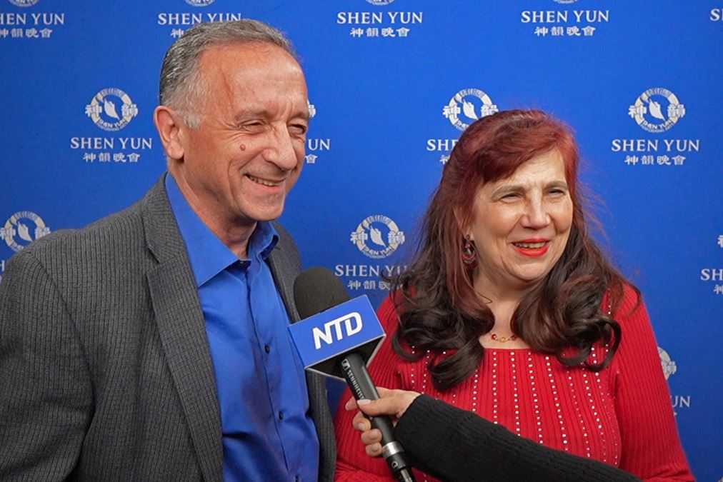 “我爱神韵,真的太美了。” 前舞蹈编导布兰迪丝・里巴(Brandis Riba)说着,做起了手势,“我爱水袖、爱那些扇子的运用,以及舞蹈中几何队形的变化,有时齐头并进,有时反向移动,时而交错变换,我非常喜爱这些流畅的旋转与移动。展现优雅的同时让人感受到力量,这是了不起的成就。看到舞蹈中的男演员的阳刚与女演员的柔美相结合,他们都如此优雅,真是莫大的享受。” 但身为舞蹈专业人士,她也非常清楚:“舞台上呈现两分钟的舞蹈,至少需要十小时的排练,而这还仅仅只为了学会舞蹈动作,更别提要做到将其完美呈现了。神韵蕴含了极大的奉献与牺牲,但(神韵艺术家们所做的)一切都值得。” 她也非常赞赏神韵演出中舞蹈和音乐的互相映衬:“舞蹈其实是对音乐的肢体表达,这才是舞蹈的真正定义。作为舞蹈编排者和舞蹈演员,我们总是努力让舞蹈(在舞动时能够)呈现出音乐的感觉,同时也让舞动赏心悦目。在神韵演出中这一切是如此的美妙。” 好莱坞电影制作人赞神韵:众多才华交织融合 带来独特体验 !唐!人:电视台)'> 图9:二零二五年三月十九日晚,好莱坞电影制作人夫妇托尼‧多迪(Tony Dody)和克里斯蒂娜‧坎杜罗(Cristina Candullo)经过长途飞行,在佛州西棕榈滩观赏了神韵演出。(新!唐!人:电视台) |