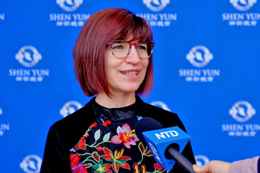 在好莱坞工作多年的电影制作人托尼‧多迪(Tony Dody)赞叹神韵的天幕 “令人惊艳”,他说:“在观众席上欣赏演员从舞台上消失融入天幕,这绝对是尖端技术,实在美妙至极。我强烈推荐大家来观赏。” “这场演出让人感到无比放松与平静。”他认为这和演出中所有元素的完美融合有关,结合多年影片制作的经历,他体会到:“当一切元素达到谐和时,最终呈现出的作品会是极其美丽的。”“(神韵)音乐、视觉效果以及所有元素的完美融合,我特别欣赏。” “神韵演出的内涵令我深深震撼,她展现了团结、爱、和平与宁静。” 他还表示,“所有人紧密合作,犹如一场动人的交响乐,众多才华交织融合,为大家带来独特美妙的体验。向创意总监和整个团队致敬。” 加拿大艺术系教授:从神韵中获得灵感 !唐!人:电视台)'> 图10:二零二五年三月二十三日下午,加拿大乔治亚学院设计与视觉艺术系教授安德莱娅・温克巴赫(Andrea Wenckebach)在加拿大密西沙加观赏了神韵演出。(新!唐!人:电视台) |