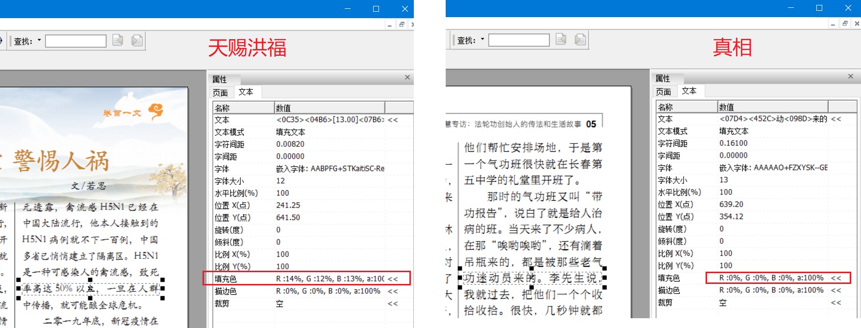 | 【明慧网二零二五年三月五日】近期我处按照论坛的推荐购买了一个兄弟的A3打印机(2340dw),实际使用中发现了一个问题: 打印小册子《真相》146期的效果还是挺好的,但是打印其他册子或传单效果就不好,主要是文字的颜色偏浅,且文字发虚。用福昕PDF对比《真相》与其他册子的文字字体,发现《真相》的字体颜色是纯黑色,但是其他册子的字体颜色并不是纯黑,而是深灰(参看附件图片)。 当然,在电脑上看不出什么差别,但是打印的时候效果就明显不一样。 因为灰色是黑色掺入其它彩色形成的,打印文字时机器会多喷嘴喷射,就很容易出现毛边,且明显的颜色浅,发虚。 佳能等热打印机型没有发现这种问题。 前些年大家用佳能和惠普的机器更多一些,但近几年佳能和惠普的机器适合我们用的越来越少,很多人都转向了爱普生的冷打印机型(兄弟Brother也是用的冷打印技术),而冷打印机型在自动双面打印时,一般都会自动降低打印深度,爱普生虽然有选项调整,但是调整的力度也是有限,而像兄弟这些型号就没有调整选项。所以目前有些人就是因为这个问题而在选购时犯难。 通过这次兄弟机型的测试,发现这个打印深度浅与字体颜色非纯黑有着很大关系,所以我们建议明慧编辑部,最好能告知所有册子、传单制版的编辑,主体文字颜色一定要用纯黑色,不要用灰色。 目前我们只能是用福昕PDF将各个打印版,一个页面一个页面的去修改文字的颜色(填充色),非常的麻烦费劲,希望以后不要再有这样的问题了。 |