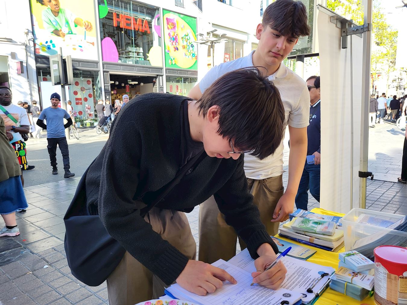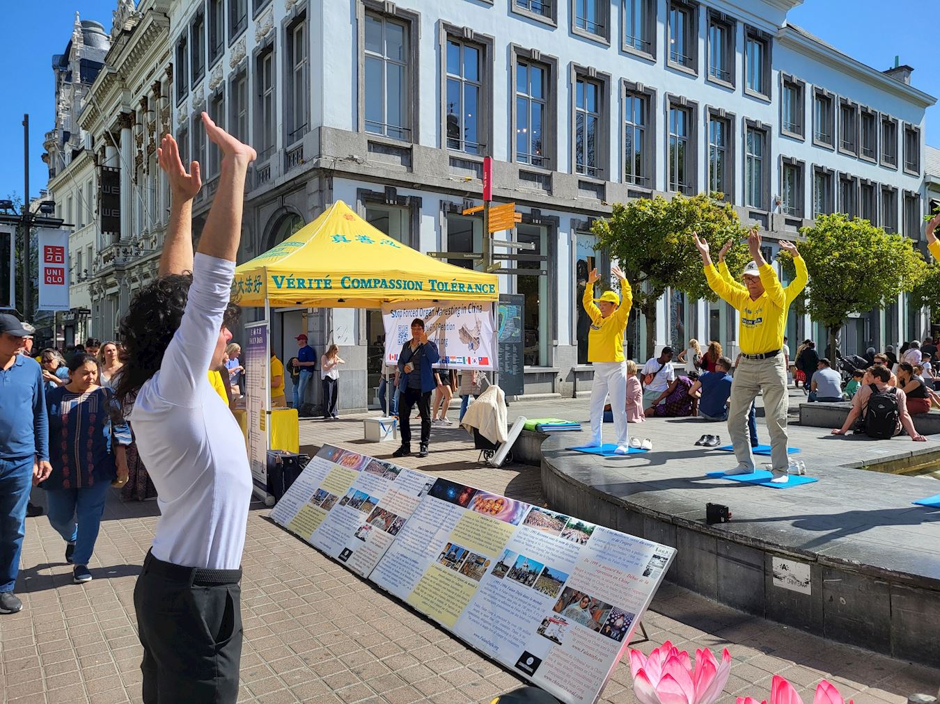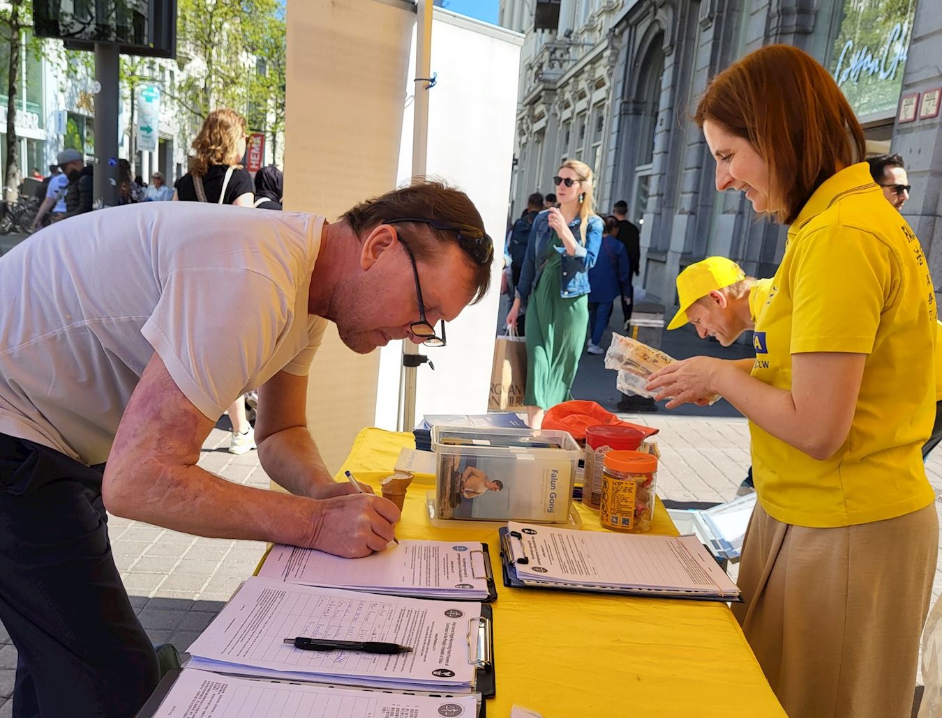 | 【明慧网二零二五年四月十七日】(明慧记者唐容比利时安特卫普报导)二零二五年四月十二日,在比利时安特卫普繁华的商业街梅尔(Meir)街头,法轮功学员向民众展示法轮功功法并传播真相。黄色帐篷下的资料桌上有不同语种介绍法轮功资料,以及中共持续二十五年的迫害真相资料。 来往的比利时民众和各国游客都对中共残酷迫害法轮功的恶行表达强烈不满,并赞赏法轮功修炼者展现出的平和与坚韧。他们表示真善忍的原则令人敬佩,希望人人都能享有信仰与修炼的自由。许多人要求留下学炼法轮功炼功点的信息。  图1~5:比利时安特卫普繁华的商业街梅尔(Meir)街头,法轮功学员展示法轮功功法,过往关注法轮功学员的活动。 |