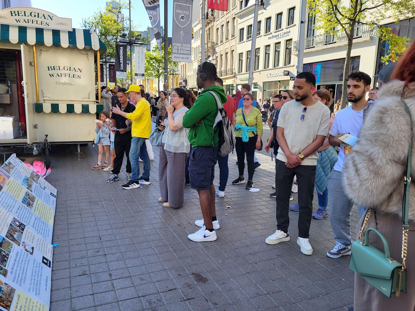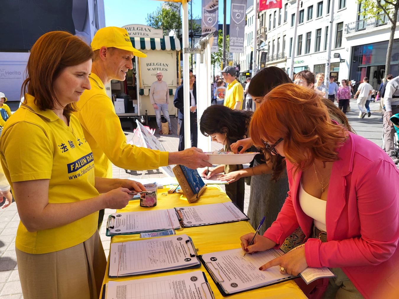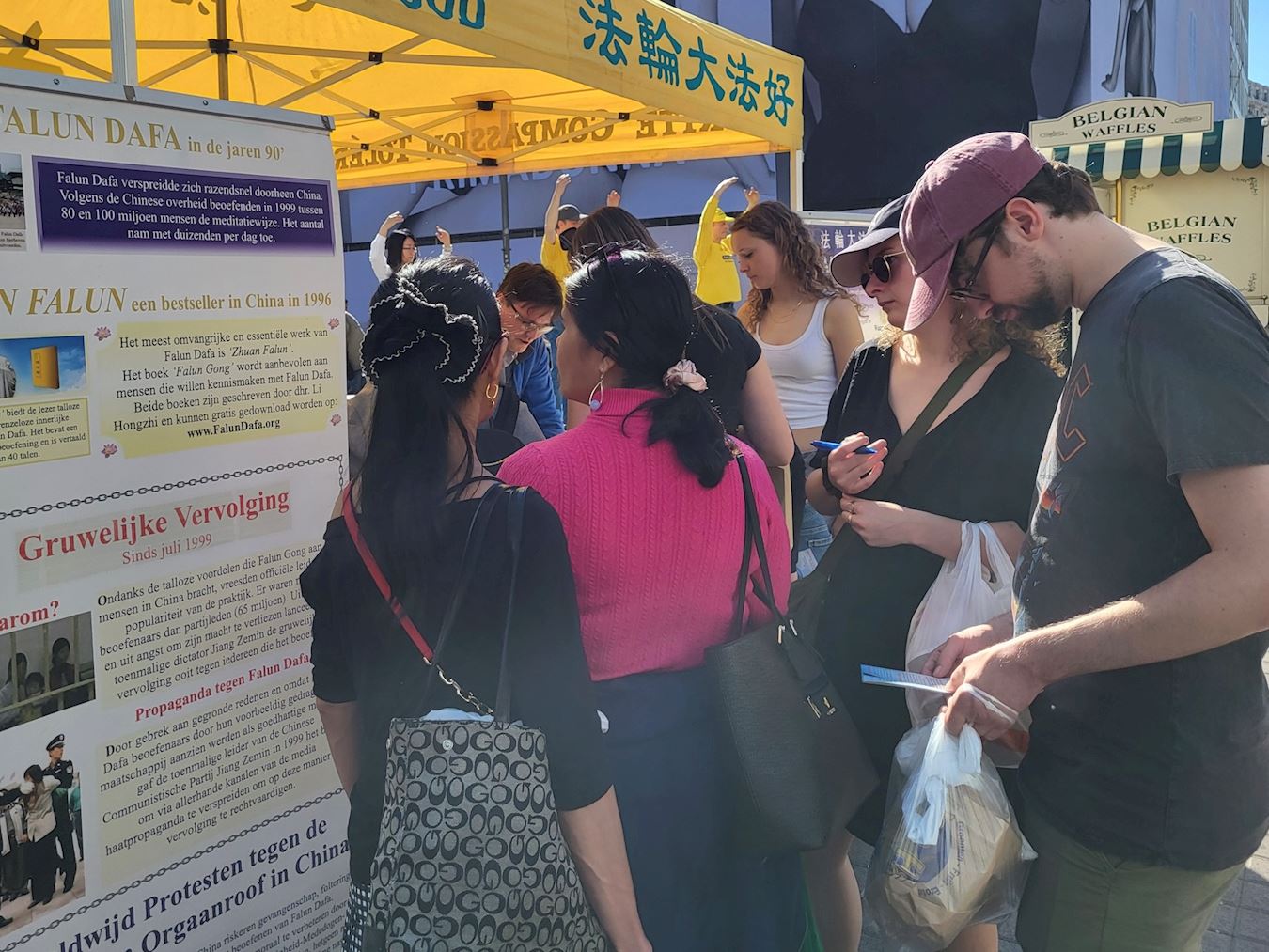 | 【明慧网二零二五年四月十七日】(明慧记者唐容比利时安特卫普报导)二零二五年四月十二日,在比利时安特卫普繁华的商业街梅尔(Meir)街头,法轮功学员向民众展示法轮功功法并传播真相。黄色帐篷下的资料桌上有不同语种介绍法轮功资料,以及中共持续二十五年的迫害真相资料。 来往的比利时民众和各国游客都对中共残酷迫害法轮功的恶行表达强烈不满,并赞赏法轮功修炼者展现出的平和与坚韧。他们表示真善忍的原则令人敬佩,希望人人都能享有信仰与修炼的自由。许多人要求留下学炼法轮功炼功点的信息。  图1~5:比利时安特卫普繁华的商业街梅尔(Meir)街头,法轮功学员展示法轮功功法,过往关注法轮功学员的活动。 |