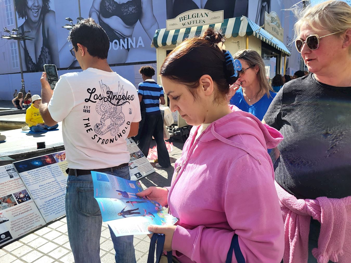 尼古拉斯一边观看学员功法演示一边说道,“我喜欢这个功法。因为我是退伍军人,经历过太多压力,也许修炼法轮功对我会有帮助。” 当他得知中共对法轮功的长期打压,尤其是已经持续了二十五年的残酷迫害时,神情中露出震惊与不解:“这让我觉得很奇怪。人们身心变好、思想变正,为什么要禁止?”他继续质问道,“如果是真、善、忍的原则,那有什么不好?他们为什么要阻止人做好人?” 尼古拉斯表示中共害怕人们拥有独立思考能力,因为那种自由的精神力量,才是中共真正惧怕的。 “共产党想控制思想,不是因为真、善、忍不对,而是因为这些让人们开始质疑中共。” 谈到如今世界的焦躁与冷漠,尼古拉斯表示:“现在的人们没有耐心,没有宽容心。真、善、忍是我们这个社会最缺少的东西。我会努力去做一些对别人有益的事。我喜欢你们所做的事情,让人们了解真相。” 华人后裔:我们不能再沉默 拥有四分之一华人血统的娜塔莉(Natalie)和女儿泰拉莉(Tyrallie)一起被学员功法展示吸引,与学员交谈许多,签名反迫害后,母亲娜塔莉(Natalie)表示,她早已得知法轮功在中国遭受的打压与不公。“我们以前就签过联署,支持制止这场迫害。我特别担忧活摘器官的事情,那太残忍了,完全超出了人类的底线。”她严肃地说,“这场迫害已经持续了二十五年,我们不能再沉默。”  图7:娜塔莉(中)和女儿泰拉莉(左)有四分之一华裔血统,对中共长期迫害法轮功表示强烈关注。 |