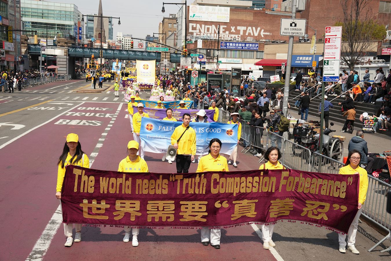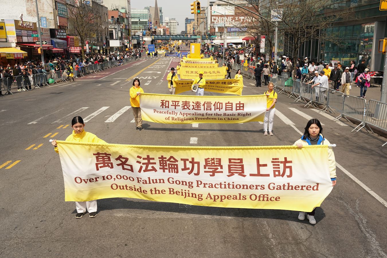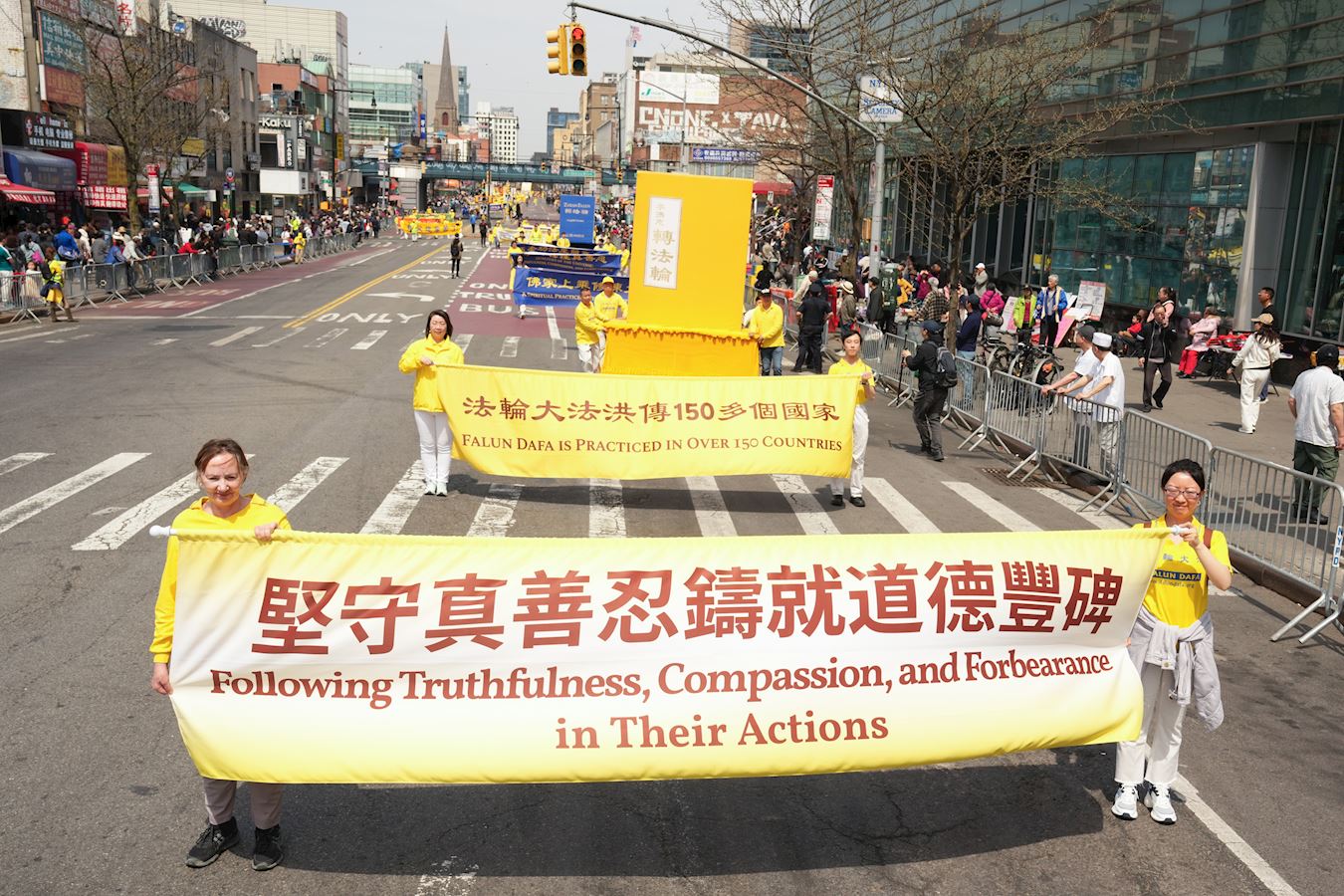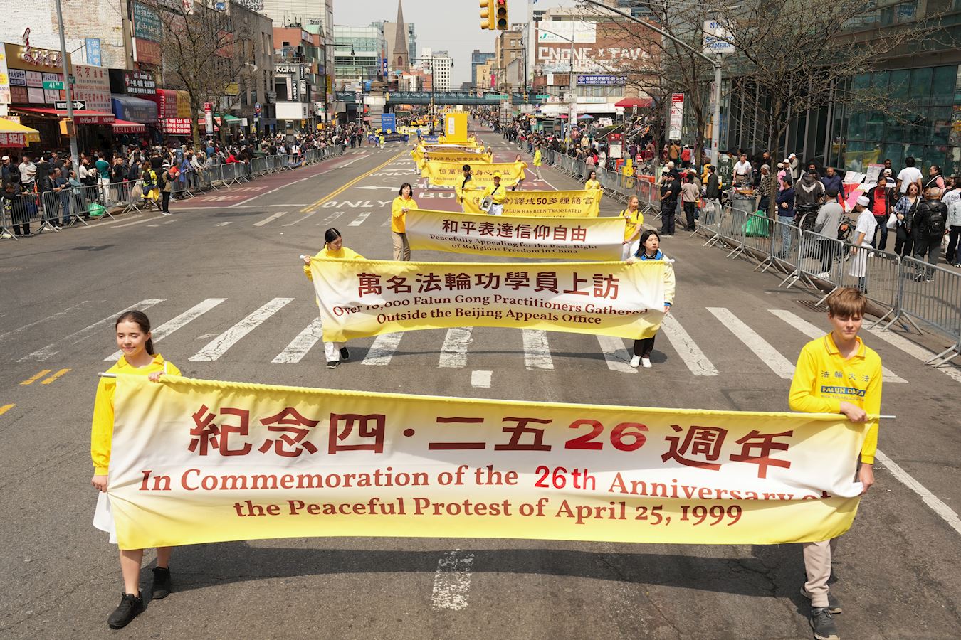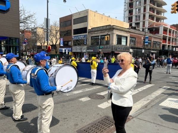 | 【明慧网二零二五年四月二十一日】二零二五年四月十九日星期六,上千名大纽约地区部分法轮功学员在全美第二大唐人街——纽约法拉盛,举行“四·二五”大游行。本次活动是纪念一九九年四月二十五日,万名法轮功学员到北京中南海信访办和平上访二十六周年,暨声援4.45亿中国人退出中共党、团、队。 中午十二点,气势恢弘的天国乐团率领浩浩荡荡的游行队伍进入法拉盛缅街时,震撼着所有人。现场观众纷纷表达心声:“就是一个字,好!”“这个法轮大法感觉很好!”“‘真、善、忍’给人带来希望啊!我很激动!”还有的人说:“我无法停止流泪,他们让我很感动,我为他们而感到骄傲。你们必须给世界展示现在在发生(迫害),而这必须停止。”也有的说:“将来中国的希望在法轮功这里。” 一九九九年四月二十五日,万名法轮功学员在北京中南海附近的国家信访局和平上访,要求合法的炼功环境、合法出版法轮功书籍及释放当时因反映情况而被抓的天津法轮功学员。在上访时,他们和平理性地向政府反映问题,争取信仰的权利,期间表现出大善大忍的精神。当时人群秩序井然,离开时法轮功学员清理现场,连警察扔在地上的烟头都捡了起来,被称为中共建政后“最大规模、最理性平和的上访”。 纽约法轮功学员每年都会在法拉盛举行盛大游行,纪念一九九九年“四·二五”和平上访的伟大壮举。 “四·二五”亲历者的回忆 原河北工业大学讲师王炳增去年来到海外,今天首次参加纪念“四·二五”的大游行。二十六年前的四月二十五日凌晨,作为义务辅导员的王炳增先赶往火车站去北京,因为他头一天听说了共产党在天津抓人的消息,他决定今天去北京上访。 王炳增坐了一个多小时的火车,早晨九点就到了北京,然后就徒步走到了府右街的信访办。“我去得早,人还不多,后来逐渐地人就多起来了。我们都站着,都很安静,没有口号,也没有标语,秩序井然,也没有走动,而且都没有吃东西,怕上厕所也不喝水,就静悄悄地站那儿,旁边的警察们,都在那聊天。” 王炳增回忆说,“后来听说几个代表进去和朱镕基见了面,说给几项要求都答复了,人们听到这个消息就撤离了,我就直接奔火车站,当天就回去了。” 二十六年后的今天,王炳增又一次为了同样的目的站在人群中,同样要讲清当年的上访真相,同样要站出来为法轮功说话。 因“四·二五”走入法轮功的西人学员 “四·二五”和平大上访事件把“法轮功”这个名字和法轮功学员推上了世界舞台,让很多西方人从此知道了法轮功。当时一名美国大学生利亚姆·奥尼尔(Liam O’Neill)就是其中的一个,随后不久他就正式开始了修炼大法。 他说:“那一刻我被深深地迷住了,我想深入研究一下法轮功。”他说,“后来七二零镇压开始了,我想,如果中共那么邪恶的团体迫害法轮功,那么这个法轮功就是我要找的东西。” 而修炼法轮功让他最终克服了生活中的压力、抑郁与焦虑,成为了他生活的方向。“这是我一生中第一次真正改变了我的生活,让我的生活变得更好。” 奥尼尔说,“其实从二十六年前到今天,法轮功传达的信息从来都没有变化:让我们自由地实践这种基于‘真、善、忍’的赋予生命的修行,停止迫害我们—这就是我们的信息,我们从来都没有改变过。” 华人:法轮功学员说的都是真的 民主人士魏立斌在游行前表示,“四·二五”和平上访的意义重大。他说:“因为中国人被洗脑洗得很严重,根本不知道法轮功的真相,所以让他们知道真相是非常重要的事情。”他说,“我是非常同情受迫害者法轮功的,‘四·二五’的意义就在于让世界一起站出来,为我们受害者、为法轮功说话。” 一位陈女士表示,她非常同意法轮功讲的“真、善、忍”原则。她说:“他们说的一句话很好:就是道德提高上来了才有救,这句话我要听。”陈女士说,“游行非常壮观,我很自豪。”  图17:纽约华裔居民陈女士第一次看到法轮功游行非常激动。 |