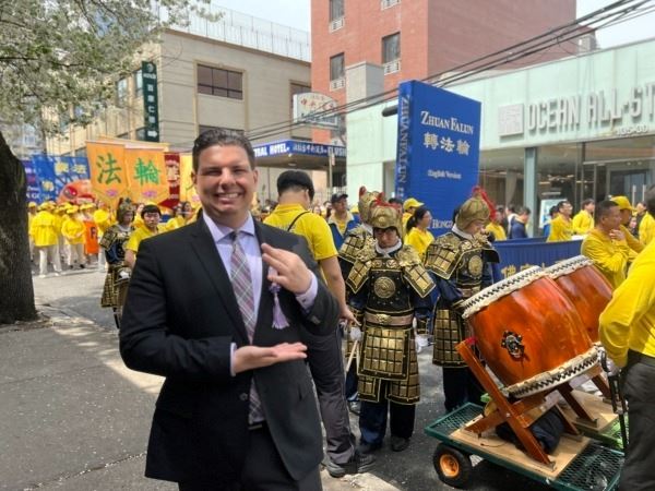 从合肥来旅游的皮先生第一次在海外看到这么大规模的法轮功游行,看到美国这么自由,他表示很高兴;来自哈尔滨的做生意的汪女士一直笑眯眯地看着游行,说“很壮观,看着让人很激动”;一位陈先生边看游行边用手指着胸口说:“法轮功学员很用心,他们都很善良,有道德的人都是好的。” 福建的小林是来退!党!的,他从自身的亲身实践发现,“法轮功学员说的都是真的”,他表示甚至想学法轮功了。“我现在真的感觉身体健康在好转。”他说,“我认为重要的是你真的发自内心的相信,对你的身体和心灵都好。” 很多刚从中国大陆出来的年轻人,是在美国才得知法轮功真相的,他们直接参加了游行队伍,打出“我们坚决支持法轮功”的横幅。 “我感觉这些法轮功学员都是比较善良、比较可爱的。”一位赵先生说,“我今天来这里就是支持法轮功。” 纽约人:我们支持“真、善、忍” 王后区儿科医生办公室经理伊贝特亚桥(Ibetta Ponte)站在缅街上一边给游行录像,一边在抹眼泪。她说:“我太激动了,甚至无法表达。”她是去看医生的路上碰到了游行,法轮功学员坚持信仰与真理的精神深深地打动了她,“他们为了实践自己的宗教信仰就遭受了那么多苦难,真是太可怕了,他们深深地触动了我。” 伊贝特亚桥认为,法轮功学员的行为“让我们团结一致。因为世界上的人都是一样的,我很高兴他们做的一切,让这个世界知道发生了什么。”“我为此非常感激,我止不住地哭,我感到激动又开心。” 她还想对法轮功学员们说:“你们大家是我的英雄,我非常感谢你们,因为你们展示了一切,你们让我们感到羞愧。你们太棒了,超越了自我!我们有自由表达自己的声音和选择自己的宗教信仰的权利,你们没有隐藏,这件事情深深地打动了我,所以我为你们鼓掌,我非常感激你们!” 王后区波多黎各领导协会主席塞缪尔·奥尔蒂斯(Samuel Ortiz)在看到法轮功游行队伍横幅上的“真、善、忍”原则后表示,“善是一切事物的关键,理解和爱以及对每个人的尊重非常重要。” “我听说过(法轮功受迫害)这种险恶的事情,令人震惊。”他说,“我们应该联合一切力量,将迫害人的人绳之以法,我们的目标就是让人们团结起来,找出我们必须共同做的事情才能提升人类,为世界带来美好,这就是我今天在这里的原因。” 王后区白石镇市议员参选人亚历山大·卡鲁索(Alexander Caruso)也站在游行队伍前支持法轮功学员。他表示,“共产党对人们的镇压太糟糕了。”自己认同“真、善、忍”的理念,“我愿意每天教学生这些原则。”  图18:二零二五年四月十九日,王后区白石镇市议员参选人亚历山大·卡鲁索前来观看法轮功纪念四‧二五26周年游行。 |