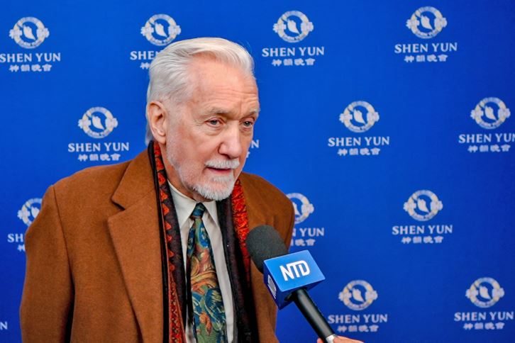 第一次观赏神韵的影视制作公司老板威尔逊(David Patrick Wilson)表示:“她绝对值得所有人欣赏。演出的壮观美妙、宏大场面、演员人数众多且协调一致,真的令人惊叹、难以置信,美妙至极。” 他说:“演出令我感到惊叹的是,我们完全无法想象,这世界可以变得如此美好。” 威尔逊认为演出传递的神性信息让人欣喜,“我体悟到,有一位神圣的创世主,他将回来救赎我们所有人,将人类与神相连。” 他说,“创世主的降临,正是我所期待的。我相信,我们所有人都在等待这一刻。” !唐!人:电视台)'> 图8:二零二五年三月二十六日,集媒体公司总裁、电视公司前首席执行官及创办人、演员、制片人、编剧及导演于一身的威廉·奥特森(William Otterson)在纽约林肯中心观赏了神韵演出。(新!唐!人:电视台) |