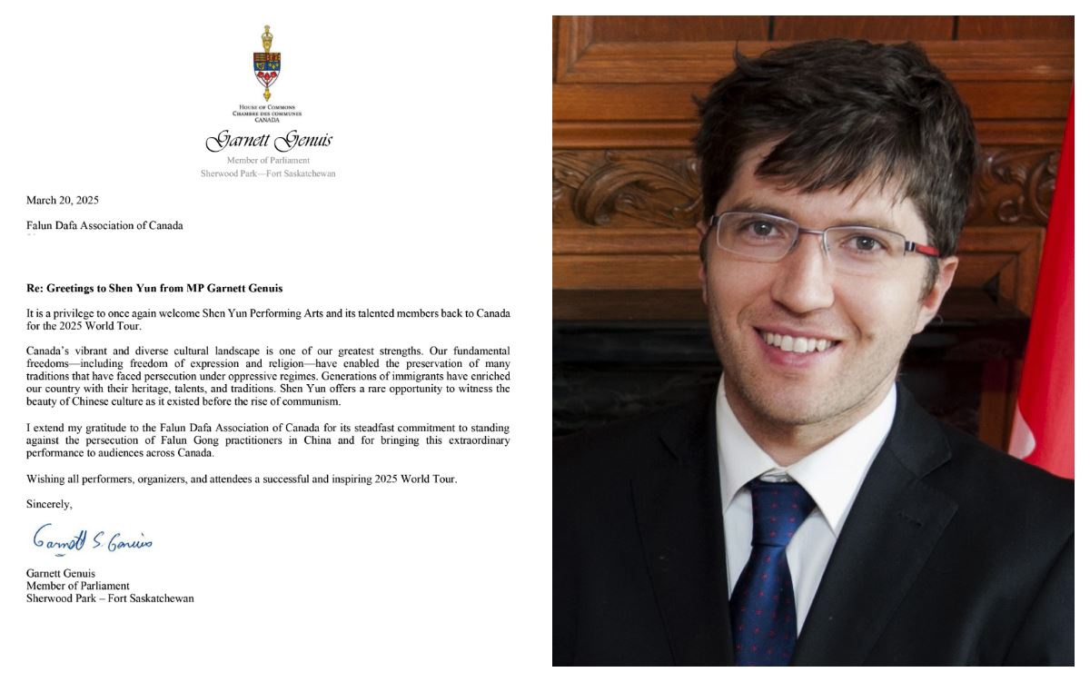 密西沙加市议员史蒂芬‧丹斯科(Stephen Dasko)观赏了神韵演出后向主办方褒奖, “这是一场神奇的演出。音乐、色彩、舞蹈都非常美丽。”“每位艺术家都才华横溢,编舞也出类拔萃。背后一定付出了大量的努力和练习,才能呈现出如此盛宴,真是太棒了。” 他说。 “每年八百场演出真的很惊人,遍布全球。这也显示艺术能跨越所有界限。” 丹斯科对神韵艺术总监表达敬意,“我真的很敬佩神韵艺术总监的创意,请继续保持这种出色的工作,继续带来这些神奇的演出。” 加拿大联邦影子内阁成员:感谢神韵让我们目睹共产主义之前的中国文化之美 .纪.元;合成)'> 图5:加拿大联邦国会议员、影子内阁部长吉尼斯(Garnett Genuis)致贺神韵艺术团。(大.纪.元;合成) |