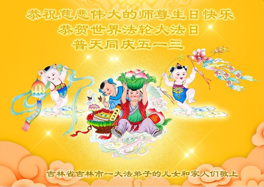 恭祝师父生日快乐!感恩师父洪传法轮大法三十三周年!恭贺世界法轮大法日!能成为您的弟子无比的荣耀、幸运、美好。二十几年的修炼路程,深深感恩师父的点悟、引领与保护,感恩师父的慈悲苦度! 吉林省吉林市一大法弟子的儿女和家人们恭祝师父生日快乐!