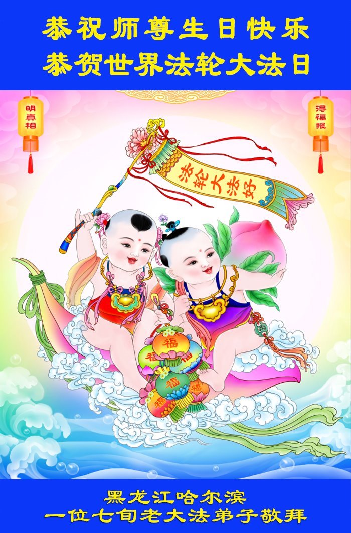 恭祝慈悲伟大的师尊生日快乐!普天同庆法轮大法洪传三十三周年和第二十六届世界法轮大法日!法轮大法好!真善忍好! 弟子定学好法、做好三件事、实修自己,助师救人,回报师恩,圆满随师还 ! 黑龙江省哈尔滨市大法弟子敬上 黑龙江省哈尔滨市一七旬老大法弟子恭贺世界法轮大法日暨师尊华诞!