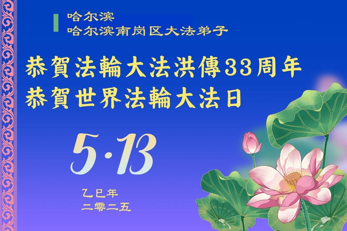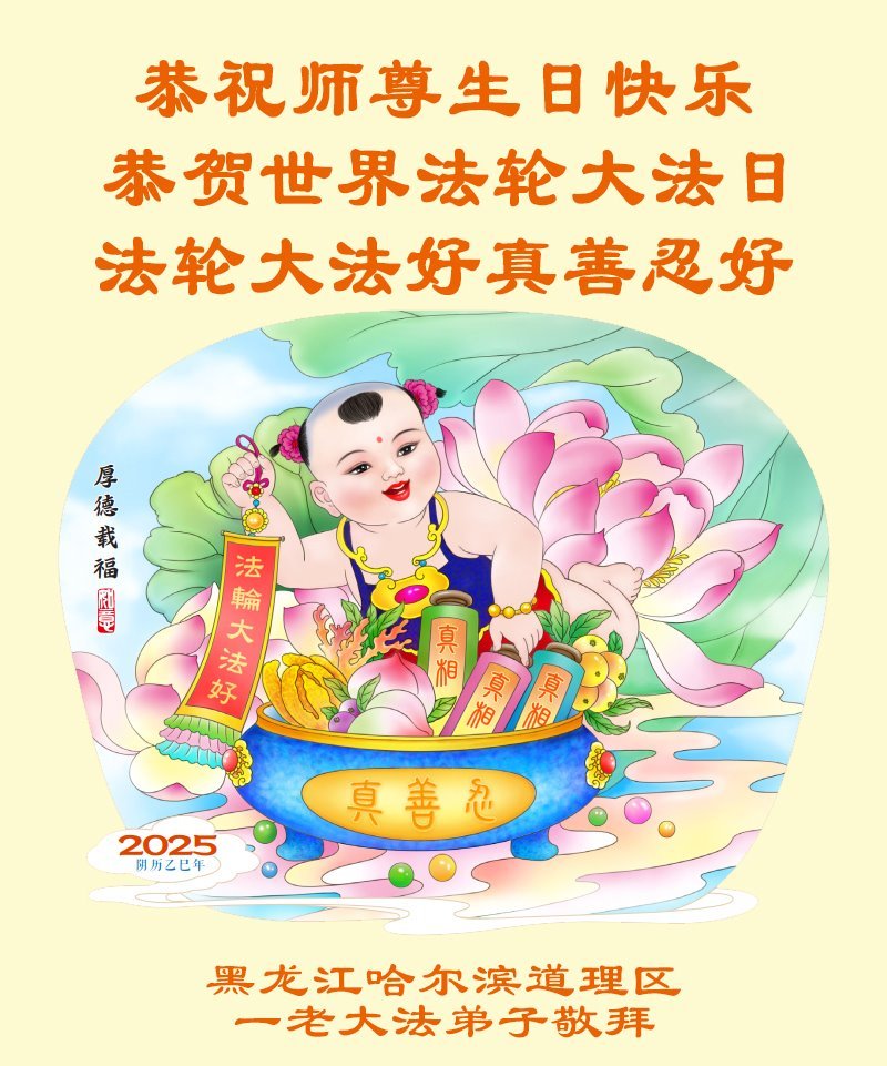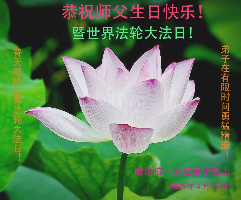 普天同庆法轮大法洪传三十三周年!恭贺第二十六届世界法轮大法日!法轮大法好!真善忍好!是师父用浩荡的慈悲救众生于危难!我们要助师正法,救度众生,带领得救的众生進入新宇宙。 黑龙江省哈尔滨大法弟子敬上 二零二五年四月二十九日 黑龙江省哈尔滨市大法弟子恭贺世界法轮大法日暨敬祝师尊生日快乐!