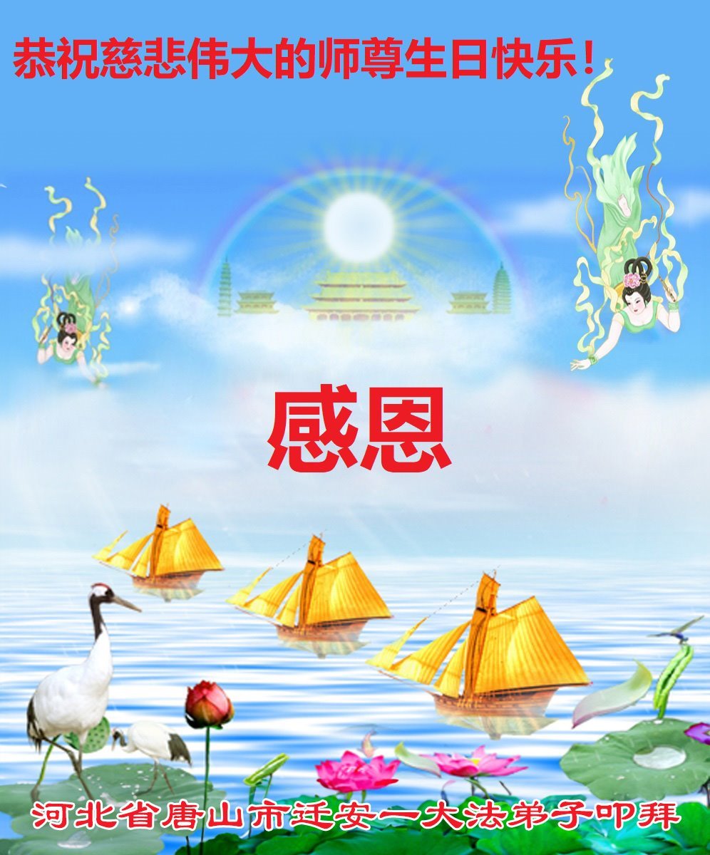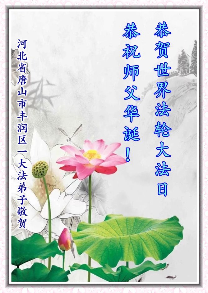 恭贺世界法轮大法日暨师尊华诞!师尊辛苦了!弟子一定不辜负师尊教诲,兑现史前大愿,好好修炼多救人,一定跟师父回家! 河北省唐山市丰润区一大法弟子敬上 河北省唐山丰润、玉田、遵化大法弟子恭贺513世界法轮大法日!