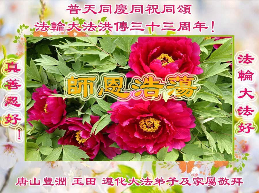 恭贺513世界法轮大法日! 恭贺法轮大法洪传三十三周年! 恭祝师尊华诞快乐! 师父好!真善忍好!法轮大法好!世界需要真善忍! 师父辛苦了!谢谢师父慈悲救度!师恩浩荡! 河北省唐山丰润、玉田、遵化大法弟子叩拜 二零二五年四月二十八日 河北省唐山市玉田县一中年大法弟子恭贺法轮大法洪传三十三周年!