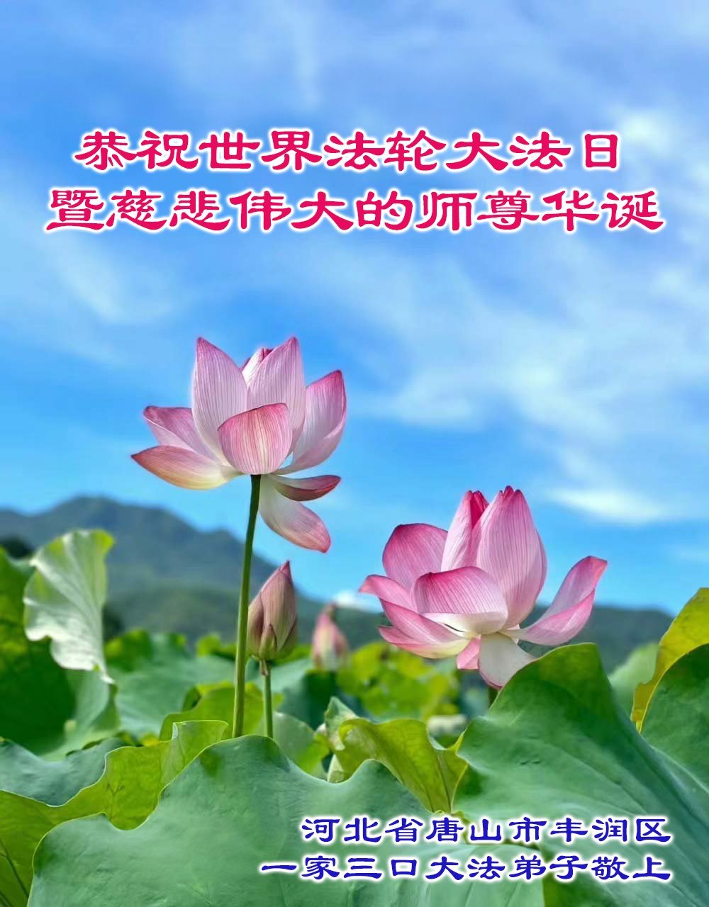 恭祝慈悲伟大的师尊生日快乐! 普天同庆世界法轮大法日! 弟子对师尊的感恩之心无法用语言表达,只有做好三件事,实修自己,多救人,圆满随师还! 河北省唐山市迁安一大法弟子敬上 河北省唐山市丰润区一家三口大法弟子恭贺世界法轮大法日!恭贺法轮大法洪传33周年!