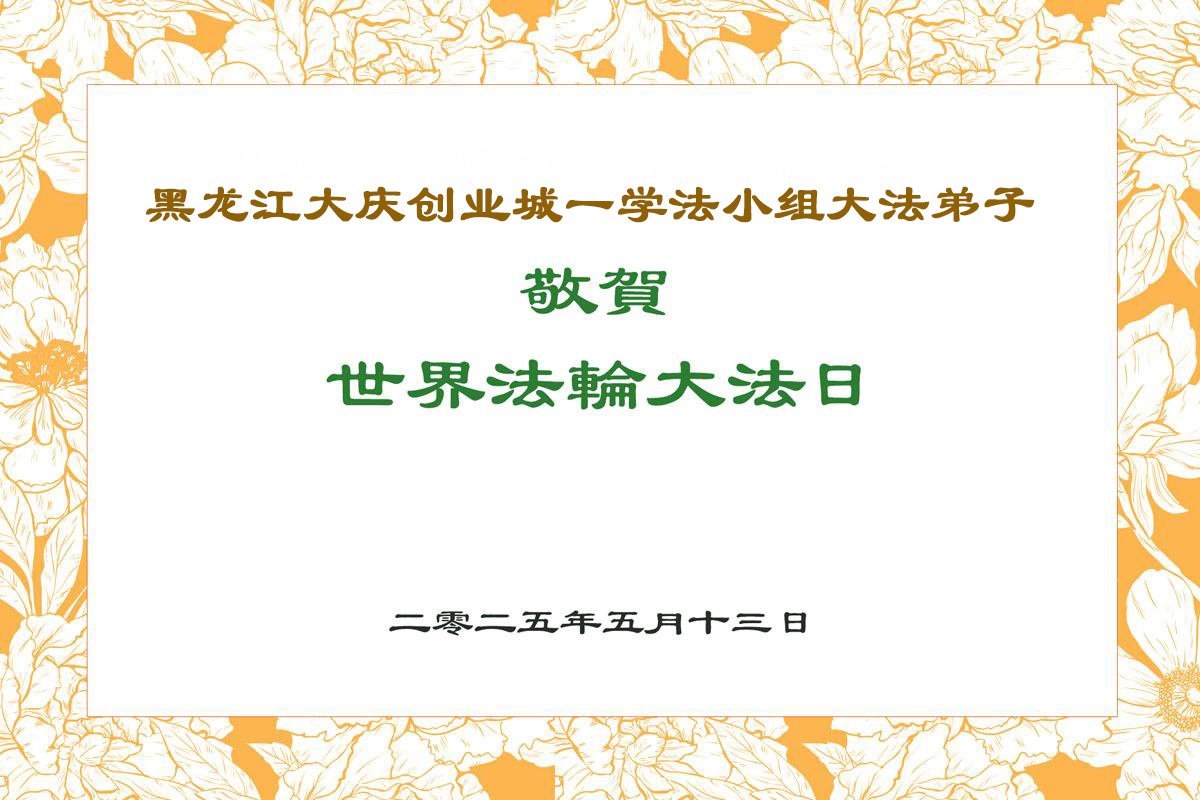 黑龙江大庆创业城一学法小组大法弟子敬上 二零二五年四月二十五日 黑龙江省大庆市萨尔图区一村学法小组大法弟子恭贺世界法轮大法日!