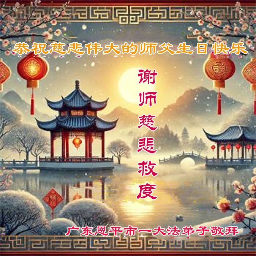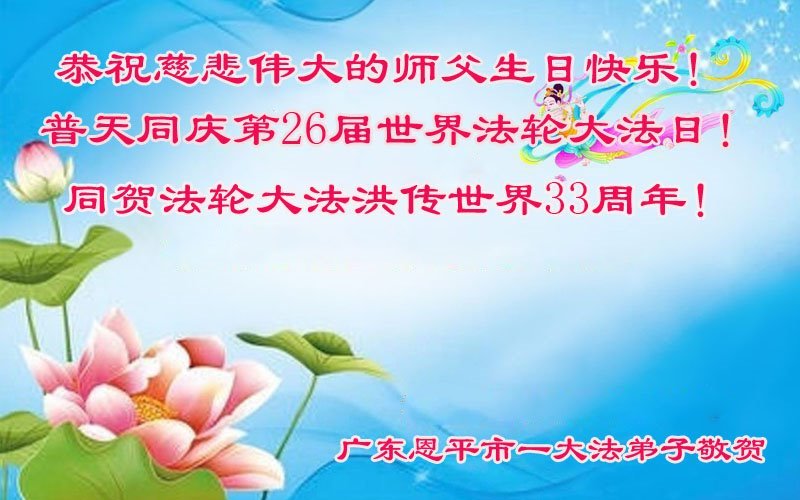 慈悲伟大的师父,是您一路引领并保护着弟子走过了二十八年的修炼路!弟子用尽人间语言,也无法表达对师父的感恩!师父辛苦了!恭祝慈悲伟大的师父生日快乐!普天同庆二十六届世界法轮大法日!同贺法轮大法洪传世界三十三周年! 广东一大法弟子恭贺法轮大法洪传33周年!恭祝师尊华诞!
