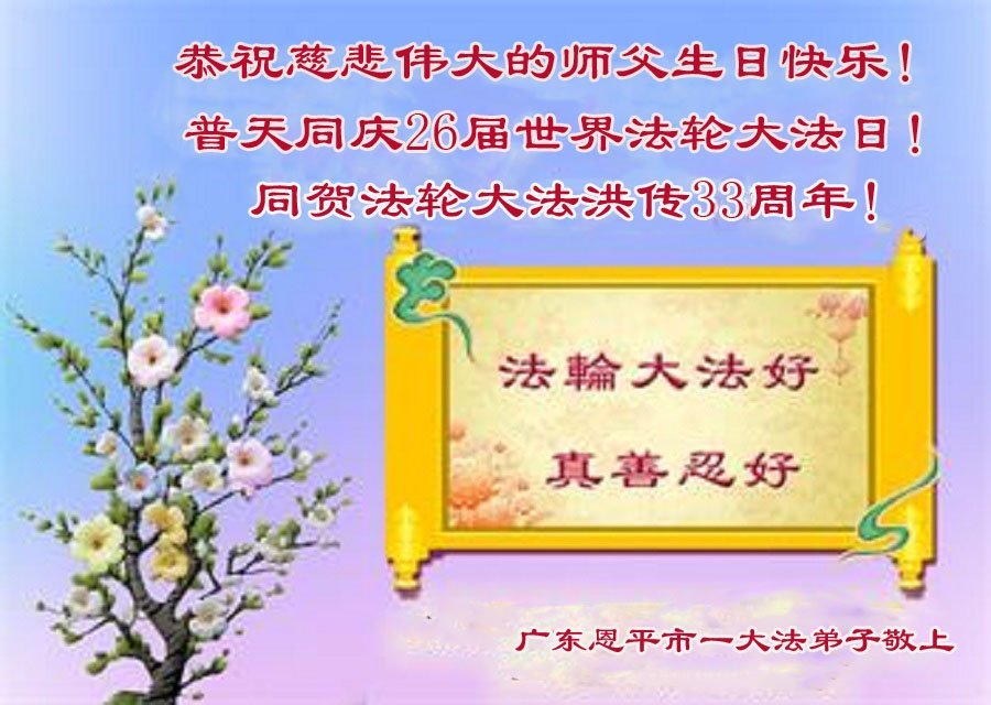 师父您好!用尽人类所有的语言也无法表达我们对您的无限感恩!法轮大法好!真善忍好! 广东省江门市恩平市一大法弟子恭祝慈悲伟大的师父生日快乐!普天同庆五一三世界法轮大法日!