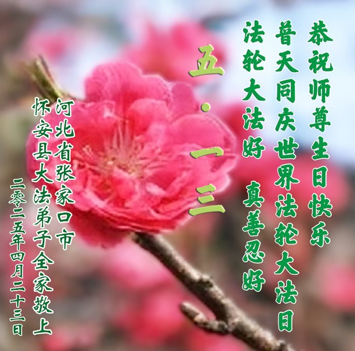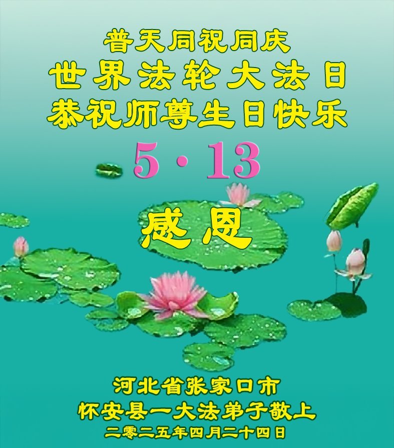 普天同庆世界法轮大法日! 在二零二五年法轮大法日即将到来之际,弟子由衷的祝贺师父生日快乐!弟子再一次保证在今后一定继续努力精進实修,去掉顽固的人心执著,把证实大法救度众生的事做的更好,完成自己的历史使命,不辜负师尊的教诲和期望。一定努力再努力。 河北张家口市一家三口大法弟子敬上 河北省张家口市宣化区恭贺5.13世界法轮大法日暨敬祝师父华诞!