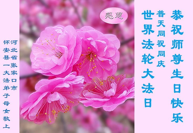恭贺世界法轮大法日! 恭祝师尊生日快乐! 河北省张家口市怀安县母女大法弟子敬上 河北省张家口市怀安县一学法小组全体大法弟子恭贺世界法轮大法日!恭祝师尊生日快乐!