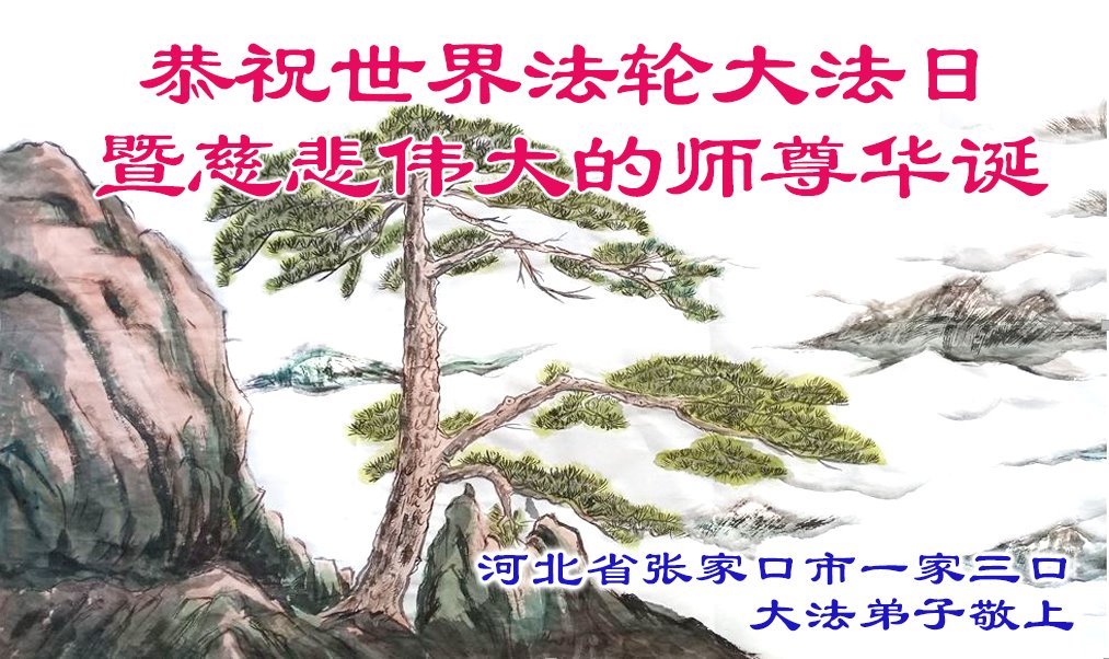 恭贺世界法轮大法日! 恭祝师尊生日快乐! 河北省张家口市怀安县一大法弟子敬上 河北张家口市一家三口大法弟子恭贺世界法轮大法日暨师尊生日快乐!