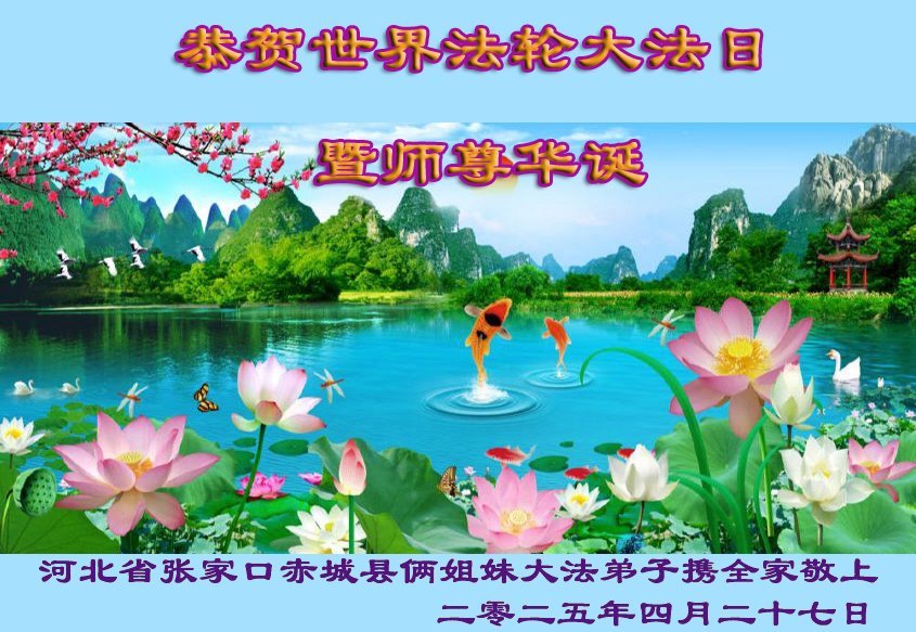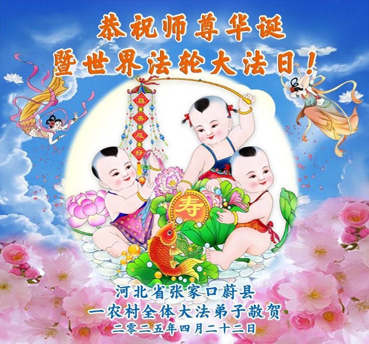 恭祝师父生日快乐!同庆世界法轮大法日! 河北省张家口市怀来县全体大法弟子敬上 二零二五年四月二十五日 河北张家口市一大法弟子携家人恭贺世界法轮大法日及师父华诞!