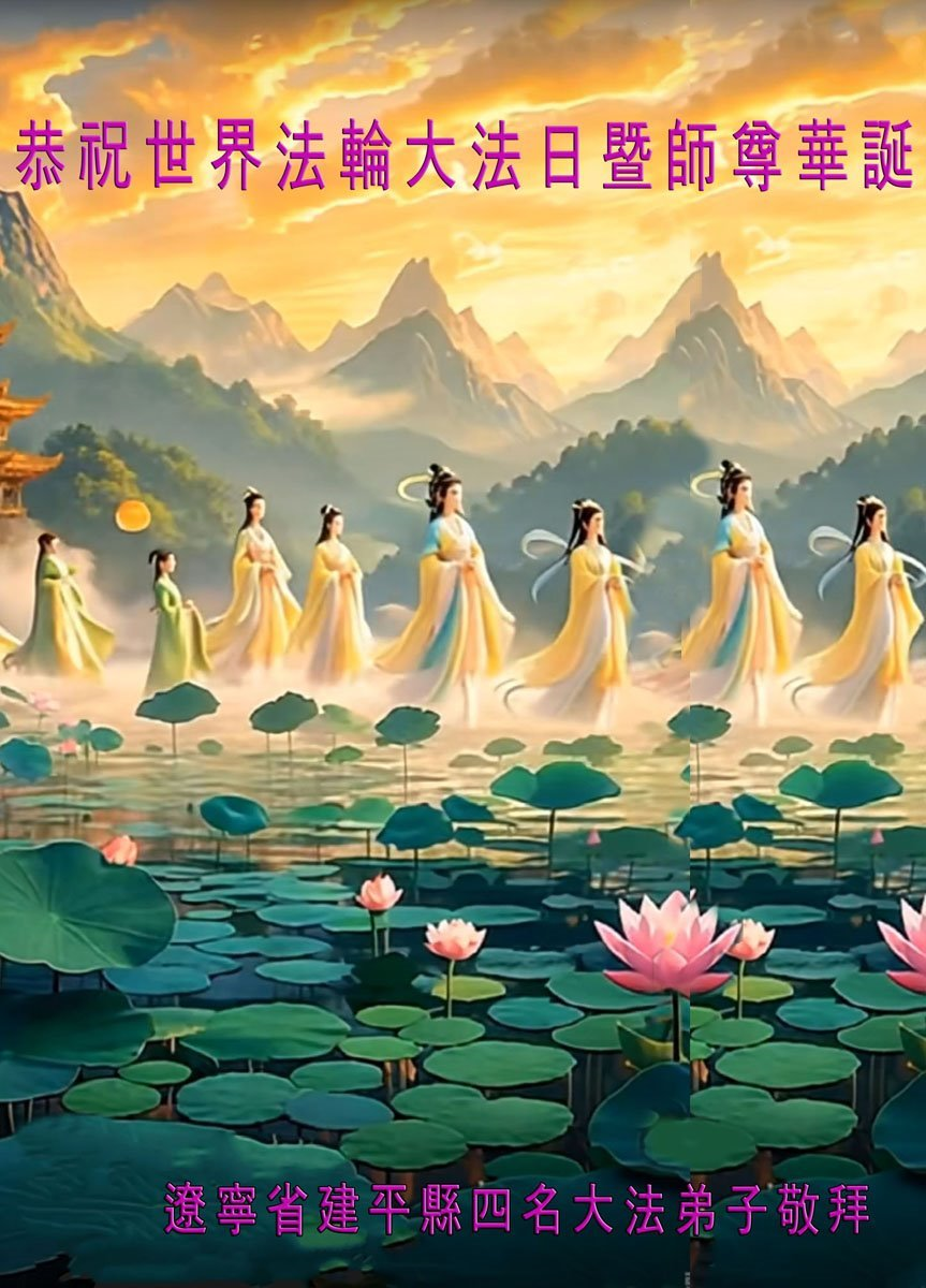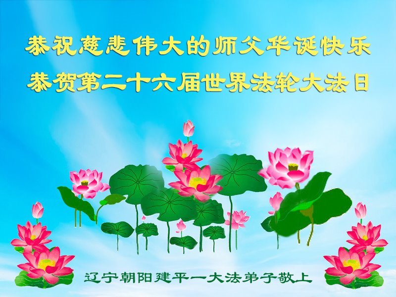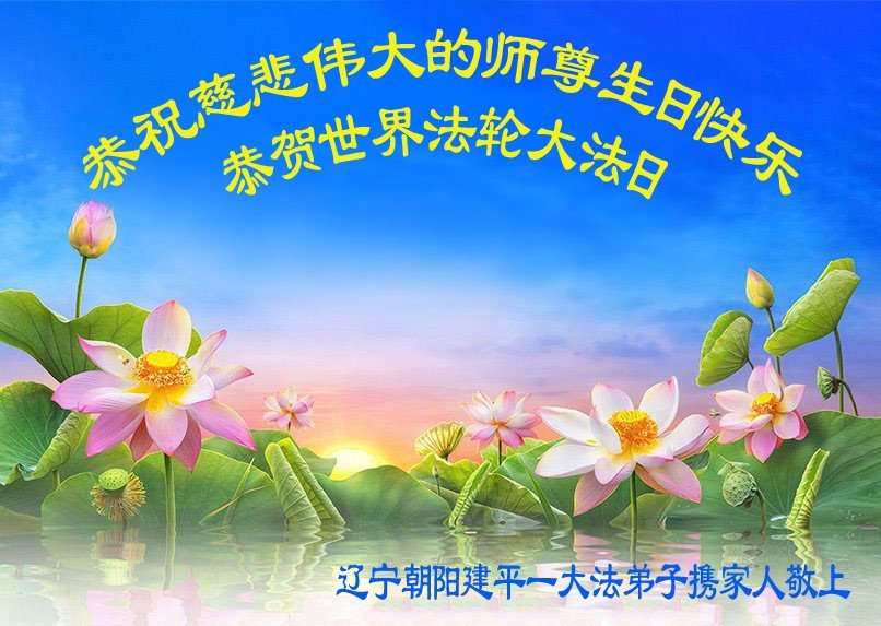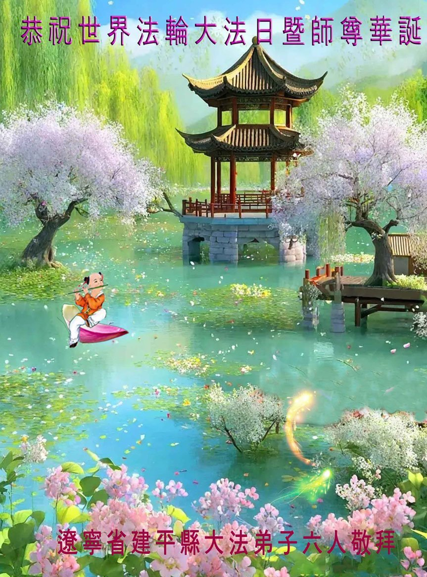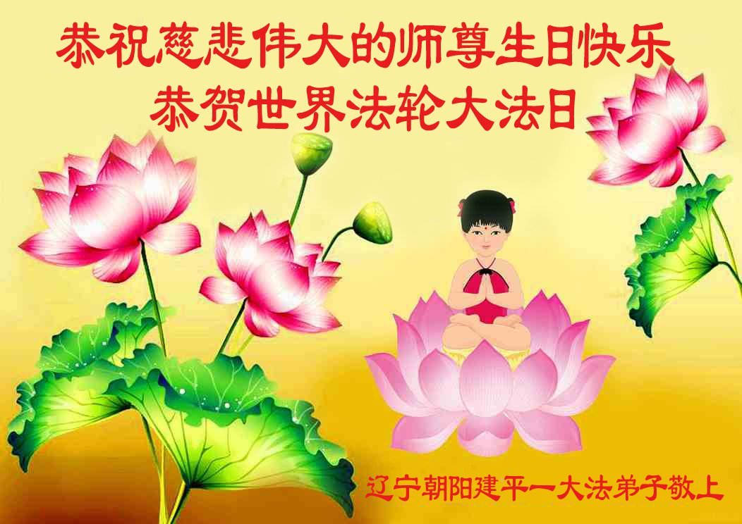 恭祝恩师生日快乐! 恭贺法轮大法洪传33周年及26届世界法轮大法日! 慈悲伟大的恩师您辛苦了,弟子得法二十六年来,每次经历的魔难、生死关都是靠法和恩师的慈悲点悟、保护,弟子无法用语言感恩您为众生和弟子们的付出。弟子只有坚信恩师、坚信大法,踏踏实实的修好自己,做好三件事,才能让师尊少一份操劳,多一些安慰,谢谢恩师的慈悲苦度。 辽宁省朝阳市建平县大法弟子敬上 二零二五年四月二十三日 辽宁省朝阳市建平县大法弟子恭贺世界法轮大法日!