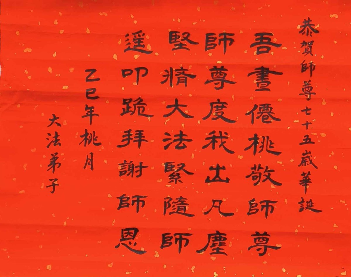 圣主慈悲洒甘露 普天同庆沐佛光 世人感恩喜得度 法徒精進书新章 |