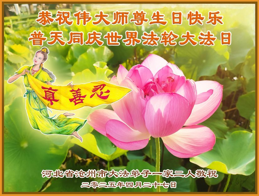 恭祝师父生日快乐!恭贺世界法轮大法日! 河北省任丘市大法弟子敬上 二零二五年四月二十九日 河北省沧州市一家二人大法弟子恭祝师尊生日快乐!同庆5·13世界法轮大法日!