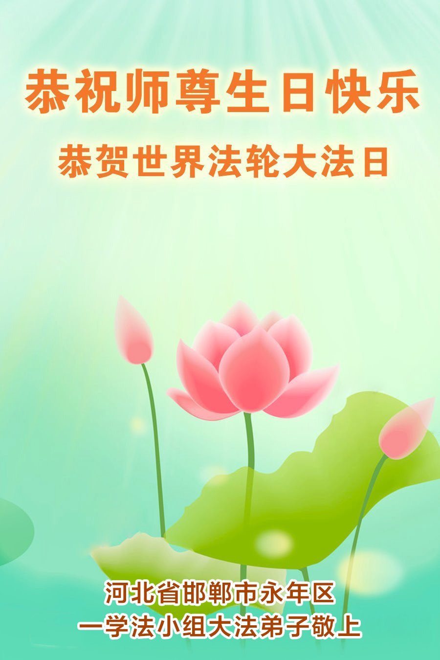 恭祝师尊华诞暨世界法轮大法日! 河北省邯郸市永年区一学法小组大法弟子敬上 河北省衡水市一大法弟子恭贺法轮大法日暨师尊生日快乐!