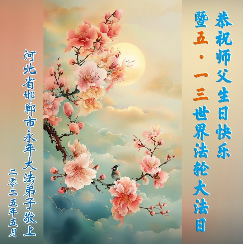 恭祝师尊生日快乐!同庆5·13世界法轮大法日! 师父您好!师父辛苦了!谢谢师父慈悲救度!在这正法所剩不多的时间里,弟子们一定珍惜修炼机缘,学好法,向内找,修好自己,圆容好整体,共同精進,跟师父回家。 河北省沧州市一家二人大法弟子敬上 二零二五年四月二十七日 河北省邯郸市永年区一大法弟子恭祝师尊华诞暨世界法轮大法日!