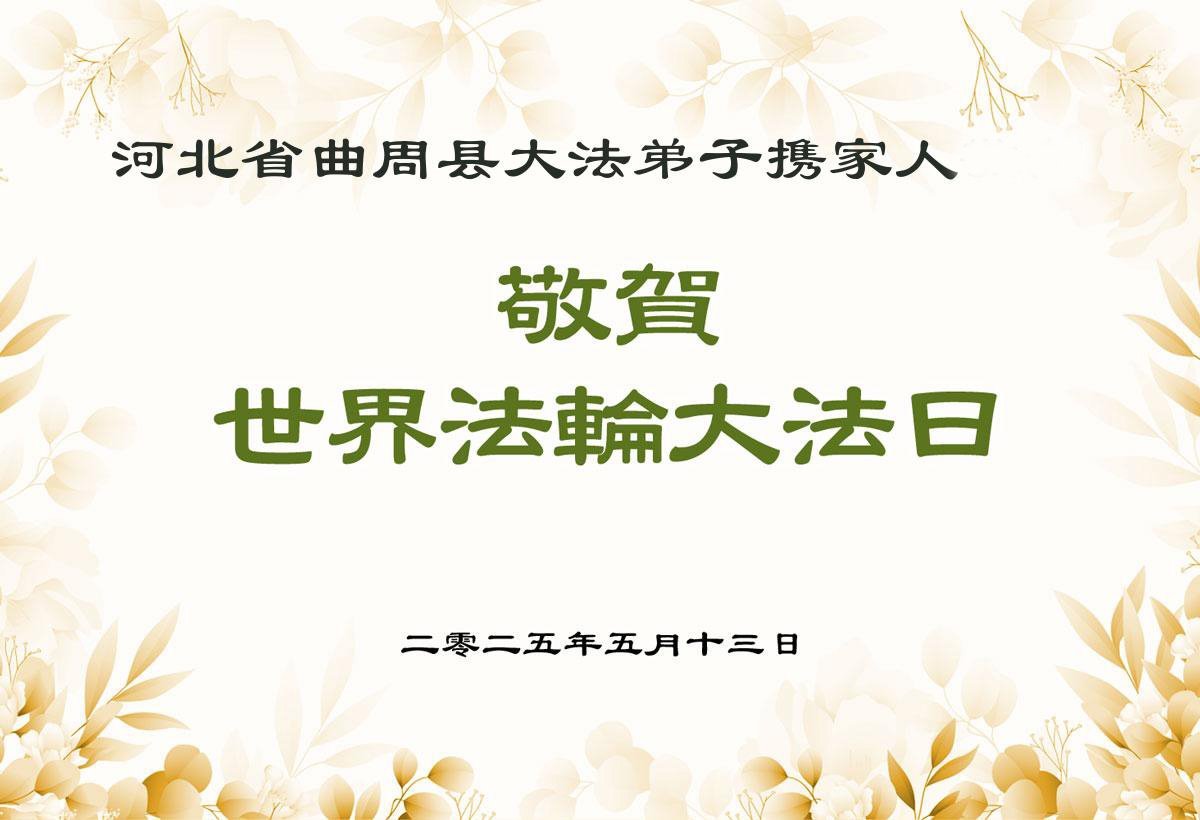师父好!谢谢师尊的慈悲救度!请师父放心,我们要共同精進,形成整体,共同做好三件事不负师恩 河北省邢台市任泽区辛店镇全体大法弟子敬上 二零二五年四月二十六日 河北省衡水市大法弟子携明真相家人恭贺世界法轮大法日暨师尊生日快乐!