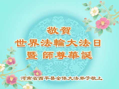 恭贺世界法轮大法日暨师尊生日快乐! 感恩师尊慈悲救度,弟子一定勇猛精進,战胜法难,再创辉煌! 河南省西平县全体大法弟子敬上 2024年4月25日 河南省驻马店市西平县某乡全体大法弟子恭贺世界法轮大法日暨师尊生日快乐!
