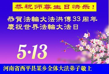 2025年4月25日 恭贺世界法轮大法日! 恭祝师尊生日快乐! 河南省西平县某乡全体大法弟子敬上 2025年4月25日 河南省信阳市大法弟子庆贺5.13世界法轮大法日!
