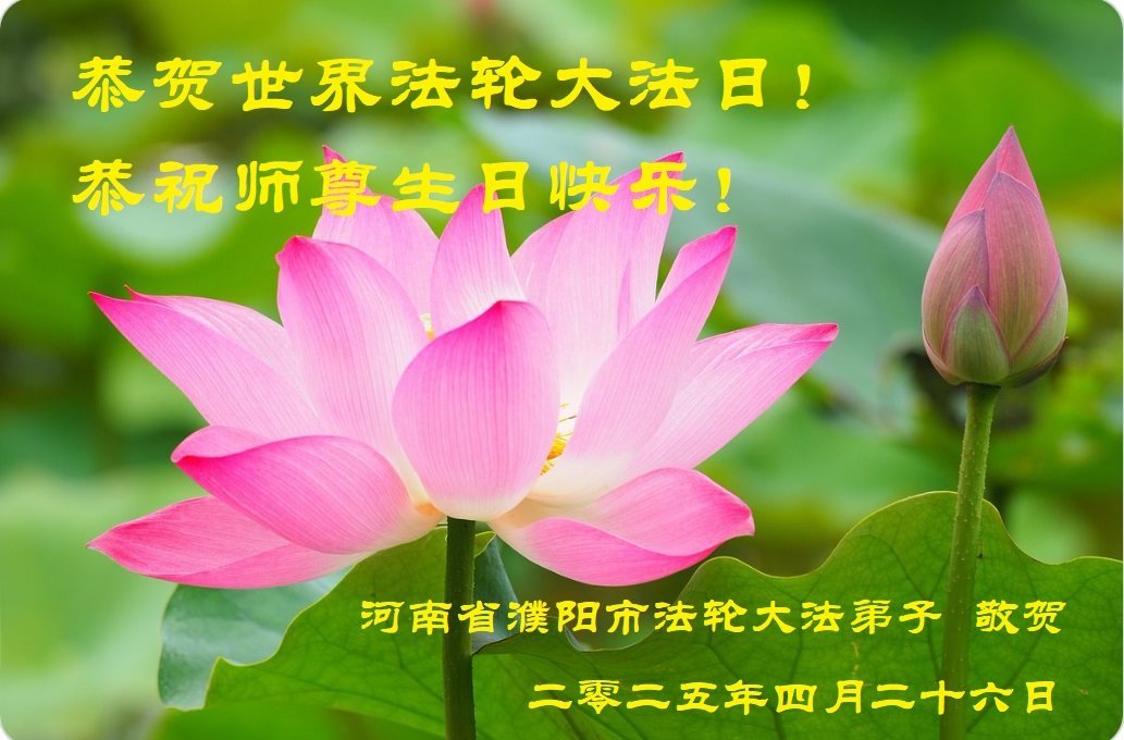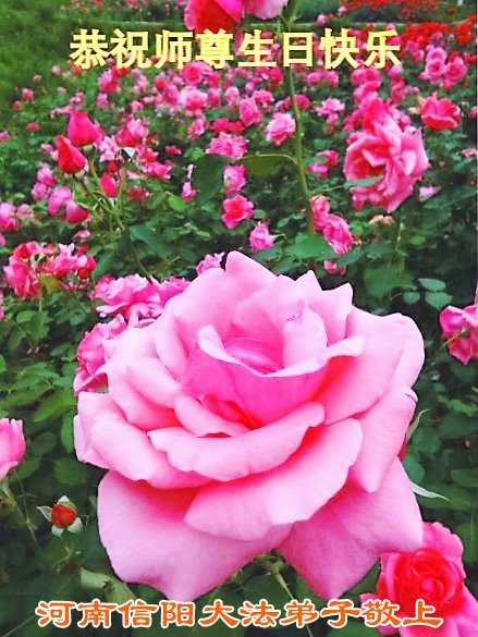 感恩师尊的救度!在世界法轮大法日来临之际,恭祝慈悲伟大的师尊生日快乐! 弟子遵照师尊的教导做一个道德升华、为别人着想的人。弟子走好以后的路,把心在法中归正。把真、善、忍这美好传递给更多的善良人,让世人选择美好的未来走向新纪元。 法轮大法对社会百利而无一害,大法洪传一百多个国家。千千万万的各国大法弟子,同庆同颂世界法轮大法日,师尊生日快乐!师尊您辛苦了! 河南省信阳市大法弟子敬上 河南省濮阳市大法弟子恭贺世界法轮大法日!恭祝师尊生日快乐!