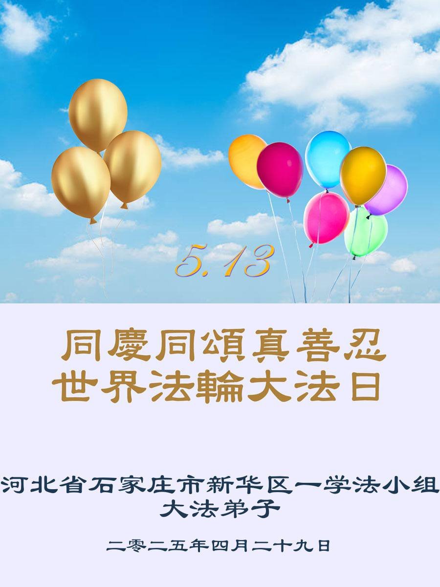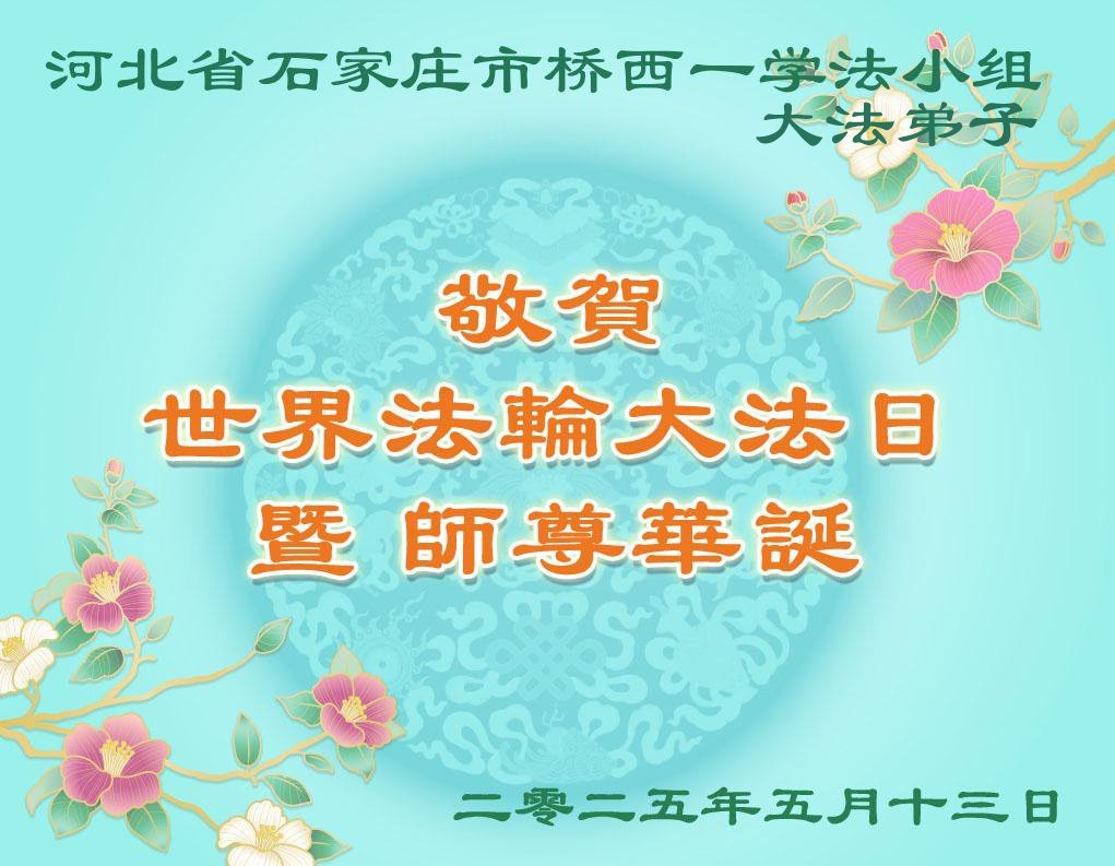 弟子感恩师尊慈悲救度!弟子一定修好自己,助师正法,救度众生,随师圆满回家! 河北省石家庄市一学法小组大法弟子敬上 二零二五年四月二十八日 河北省石家庄市桥西区一大法弟子恭贺世界法轮大法日!