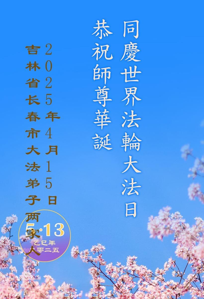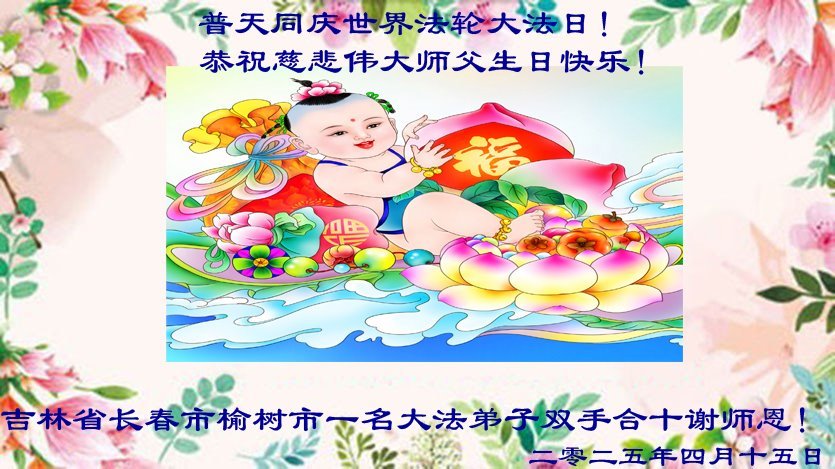 【明慧网二零二五年五月十日】 吉林省长春市榆树一大法弟子恭贺世界法轮大法日!恭祝慈悲伟大的师尊生日快乐!