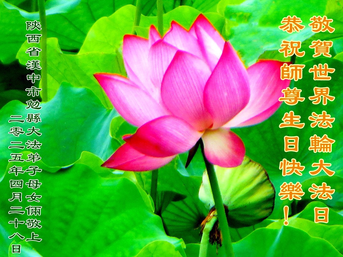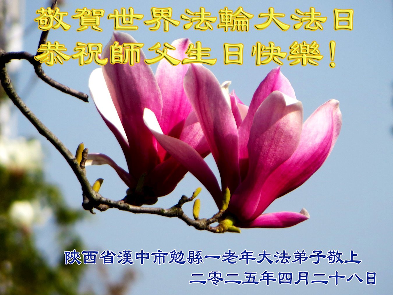 【明慧网二零二五年五月十日】 陕西省汉中市一大法弟子及儿子恭贺世界法轮大法日!恭祝伟大的师父生日快乐!