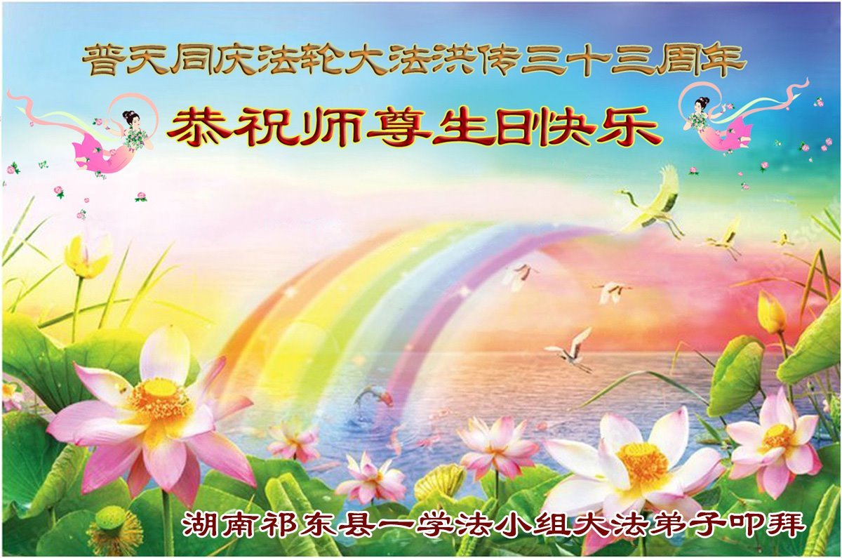 【明慧网二零二五年五月十日】 湖南省衡阳市祁东县农村一学法小组大法弟子恭贺世界法轮大法日暨敬祝师尊生日快乐!