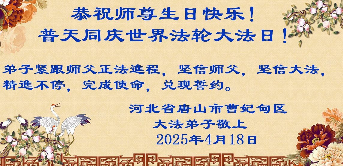 师尊好!在师尊的生日来临之际,万物更新,众生得度,弟子与众生对师尊与大法无比感恩,难以言表。唯有遵师教诲,做好三件事,兑现誓约,精進!再精進!不负师尊慈悲苦度。再次祝师尊生日快乐!谢谢师尊!跪拜师尊! 唐山市大法弟子敬上 二零二五年四月二十一日 河北省唐山市曹妃甸区大法弟子恭贺世界法轮大法日暨师尊华诞!