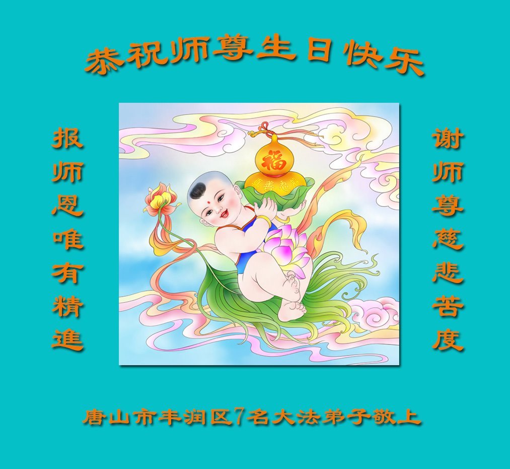 恭祝慈悲伟大的师尊生日快乐!恭贺世界法轮大法日! 河北省唐山市丰润区7位大法弟子敬上 河北省唐山市丰南区全体大法弟子恭贺世界法轮大法日暨师父生日快乐!