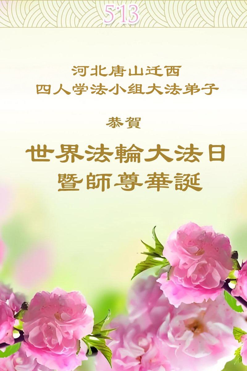 在这大喜的日子里,我们全家恭祝师父生日快乐!精進实修跟师父回家! 河北省唐山市遵化市一家大法弟子敬上 河北省唐山市五人学法小组大法弟子恭贺世界法轮大法日!