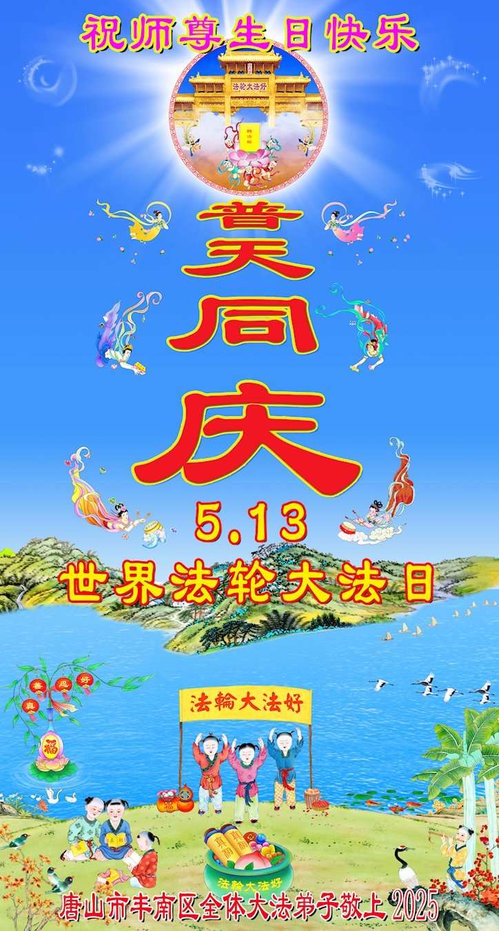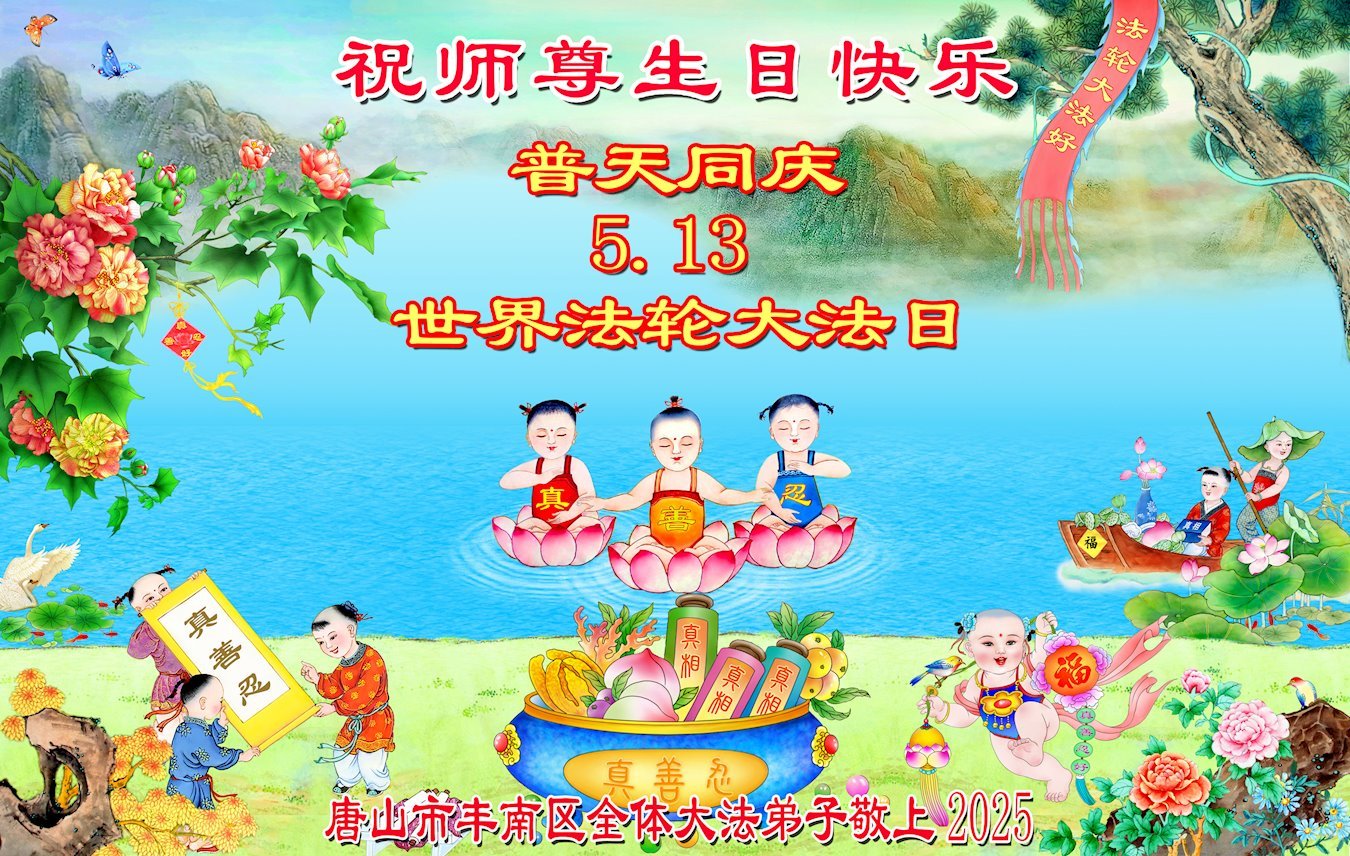 转眼又是一年的5·13世界大法日!也是我们慈悲伟大师尊的生日!在这伟大的时刻,弟子恭祝师尊生日快乐!恭贺5·13世界法轮大法日! 修炼至今,所有的问题都能在法中找到答案,让我更加体会到:做师尊的真修弟子是宇宙中最幸运的生命! 河北省唐山市曹妃甸区大法弟子及家人敬上 2025年4月18日 河北省唐山市曹妃甸区大法弟子恭贺世界法轮大法日暨师尊华诞!