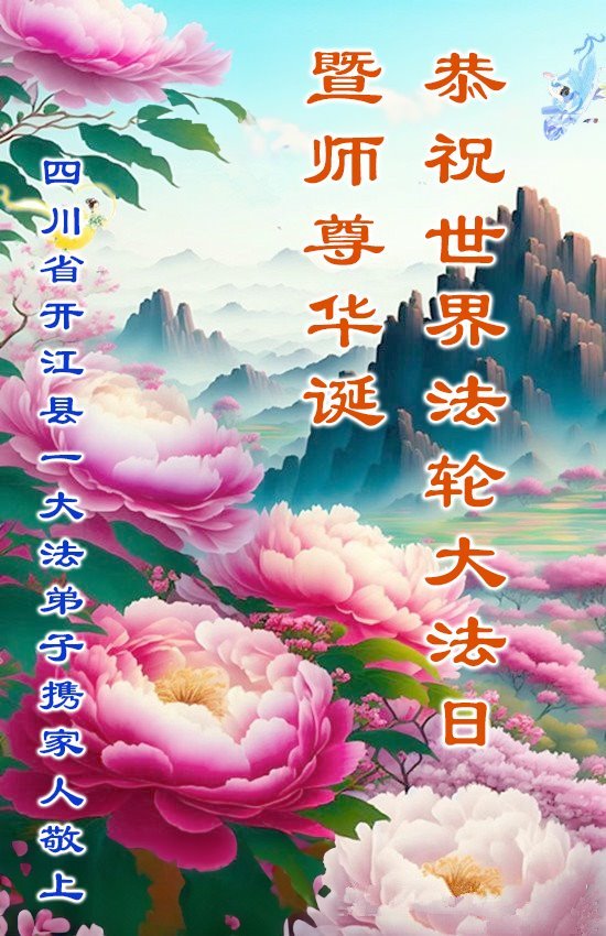恭祝慈悲伟大的师尊生日快乐! 恭贺世界法轮大法日! 同贺法轮大法洪传世界三十三周年! 四川省自贡市自流井区大法弟子敬上 四川省绵阳市一大法弟子及家人恭贺世界法轮大法日暨师尊华诞!