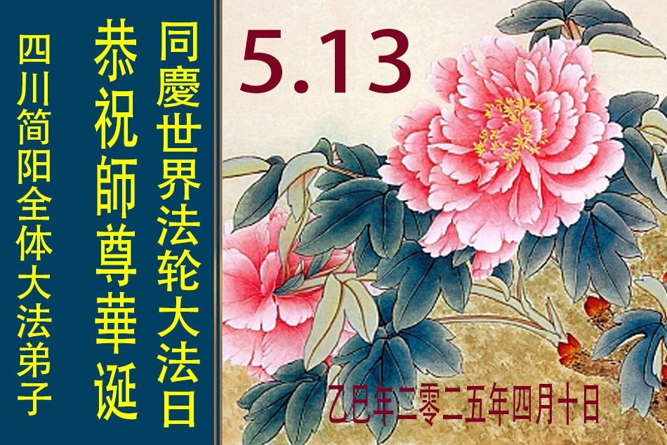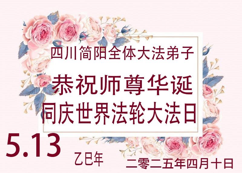二零二五年513,是师父传法于世三十三周年、是世界法轮大法日迈向第二十六届的特殊日子,天上人间,法光普照;众生万物,喜气洋洋,满怀希望。普天同庆之时,弟子们齐心献上诚挚的祝愿与感恩! 我们想念师父!盼师父早日归来!我们会牢记师父的教诲,身为大法弟子的我们,要将师尊教导我们的“真善忍”继续弘杨,让大法的甘露滋润更多的有缘人的心灵。我们唯有坚定不移走好师父安排的路,才能圆满随师还。 四川省简阳大法弟子敬上 二零二五年四月五日 四川省资阳市简阳市大法弟子恭贺513世界法轮大法日暨师尊生日快乐!