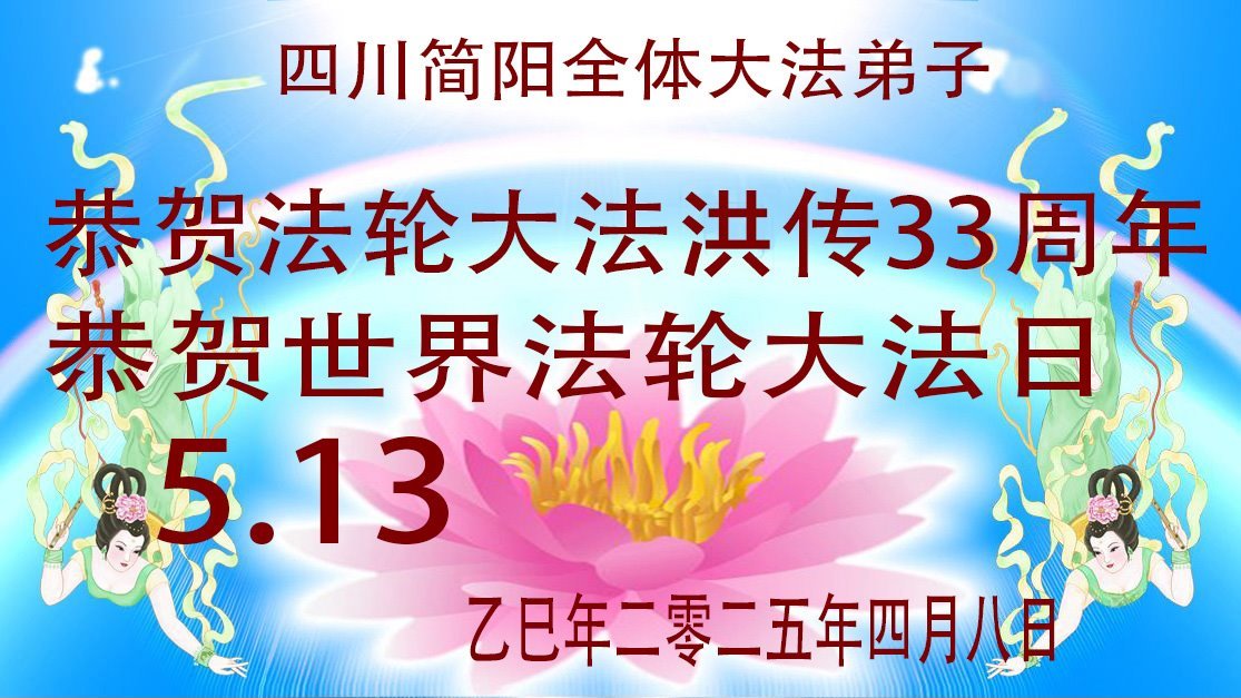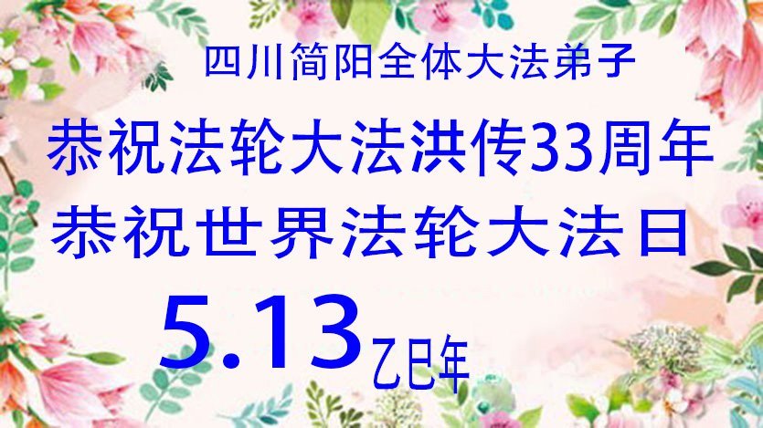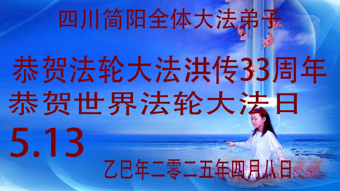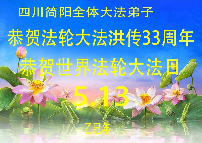 二零二五年513,是师父传法于世三十三周年、是世界法轮大法日迈向第二十六届的特殊日子,天上人间,法光普照;众生万物,喜气洋洋,满怀希望。普天同庆之时,弟子们齐心献上诚挚的祝愿与感恩! 四川省简阳大法弟子敬上 二零二五年四月五日 四川省资阳市简阳市大法弟子恭贺513世界法轮大法日暨师尊生日快乐!