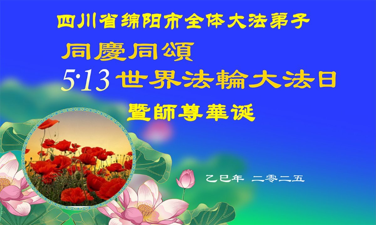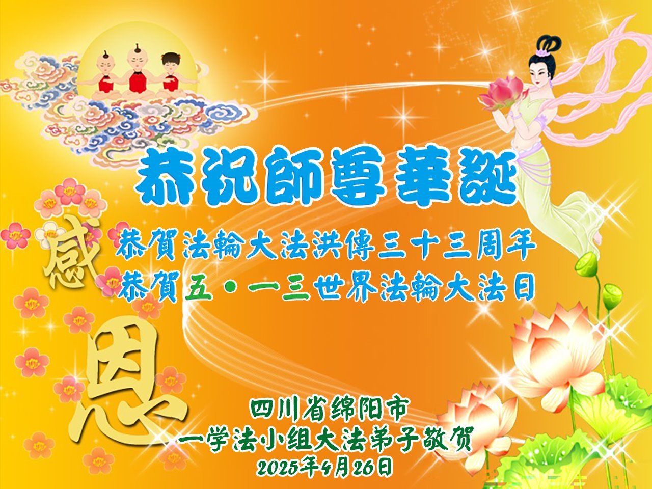 恭贺法轮大法洪传33周年! 恭贺5.13世界法轮大法日! 恭祝师尊华诞! 四川省绵阳市大法弟子敬上 2025年4月28日 |